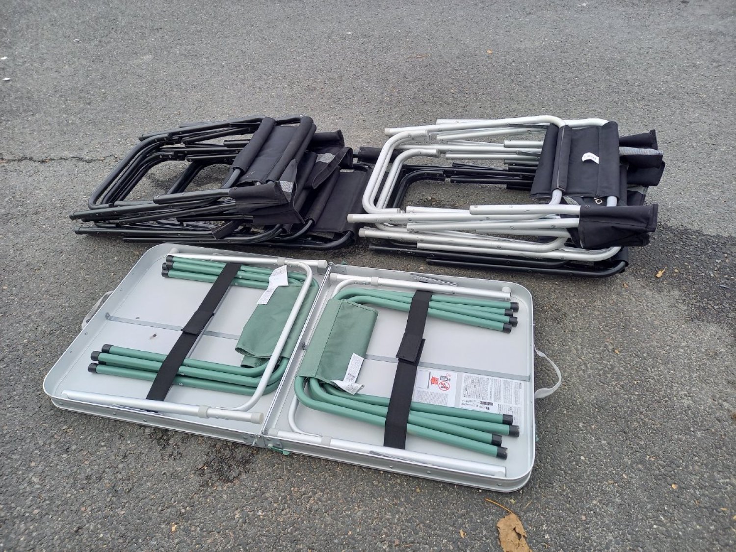 Vendu avec tous les ustensiles et vaisselle camping, table aluminium neuve, 4 chaises pliables, barbecue FIDJI, bidons entretien moteur