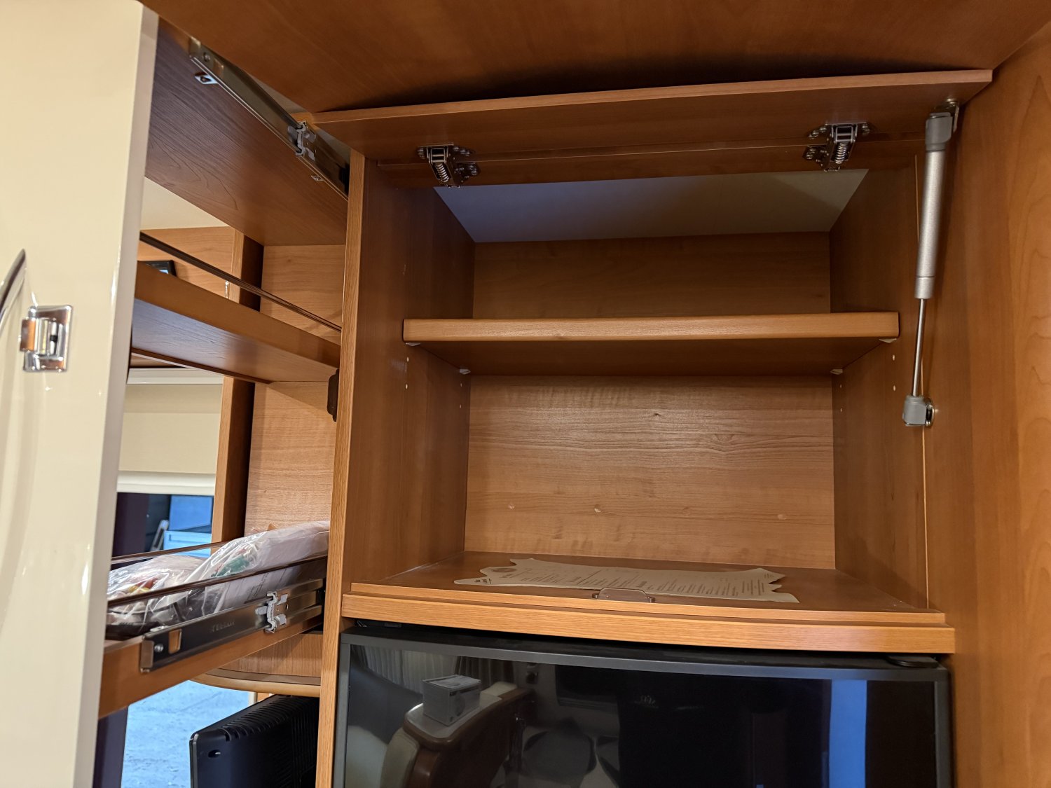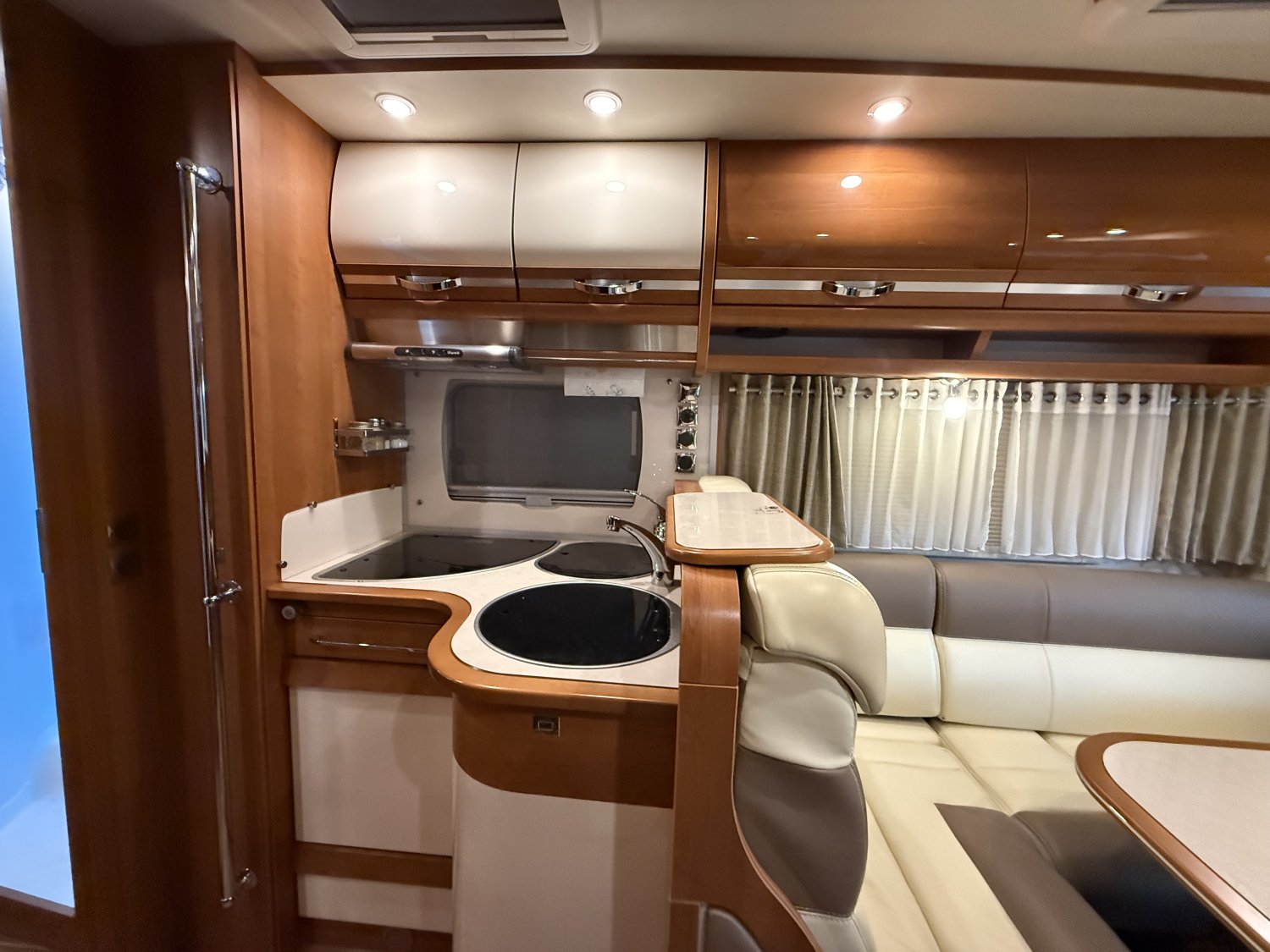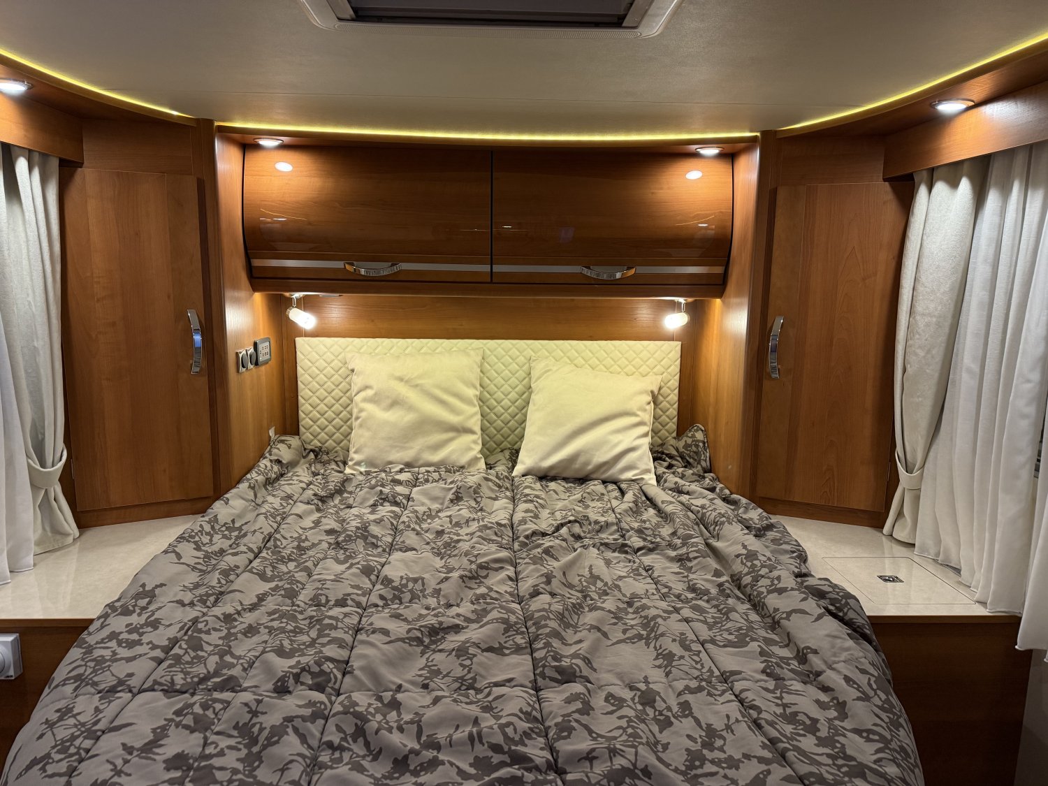 L’intérieur profite de la finition DESIGN EDITION, avec un mobilier ELEGANCE brillant intégrant des moulures en bois d’érable massif, apportant chaleur, noblesse et luminosité à l’ambiance. La configuration inclut un grand salon convivial, une cuisine bien équipée, un lit central réglable en hauteur sur soute garage, et un lit de pavillon avant, permettant de voyager à deux avec un vrai confort ou en famille selon les besoins.