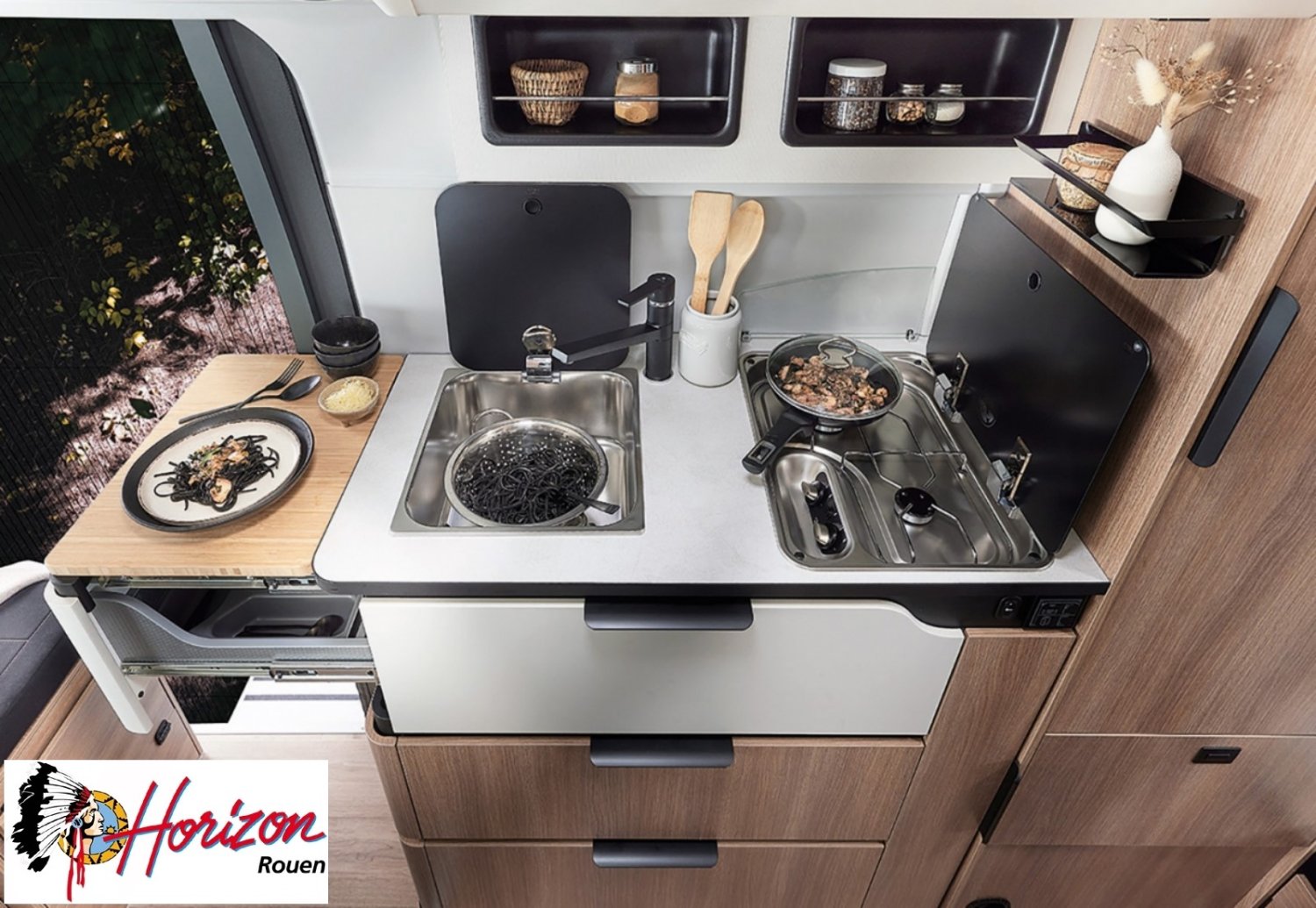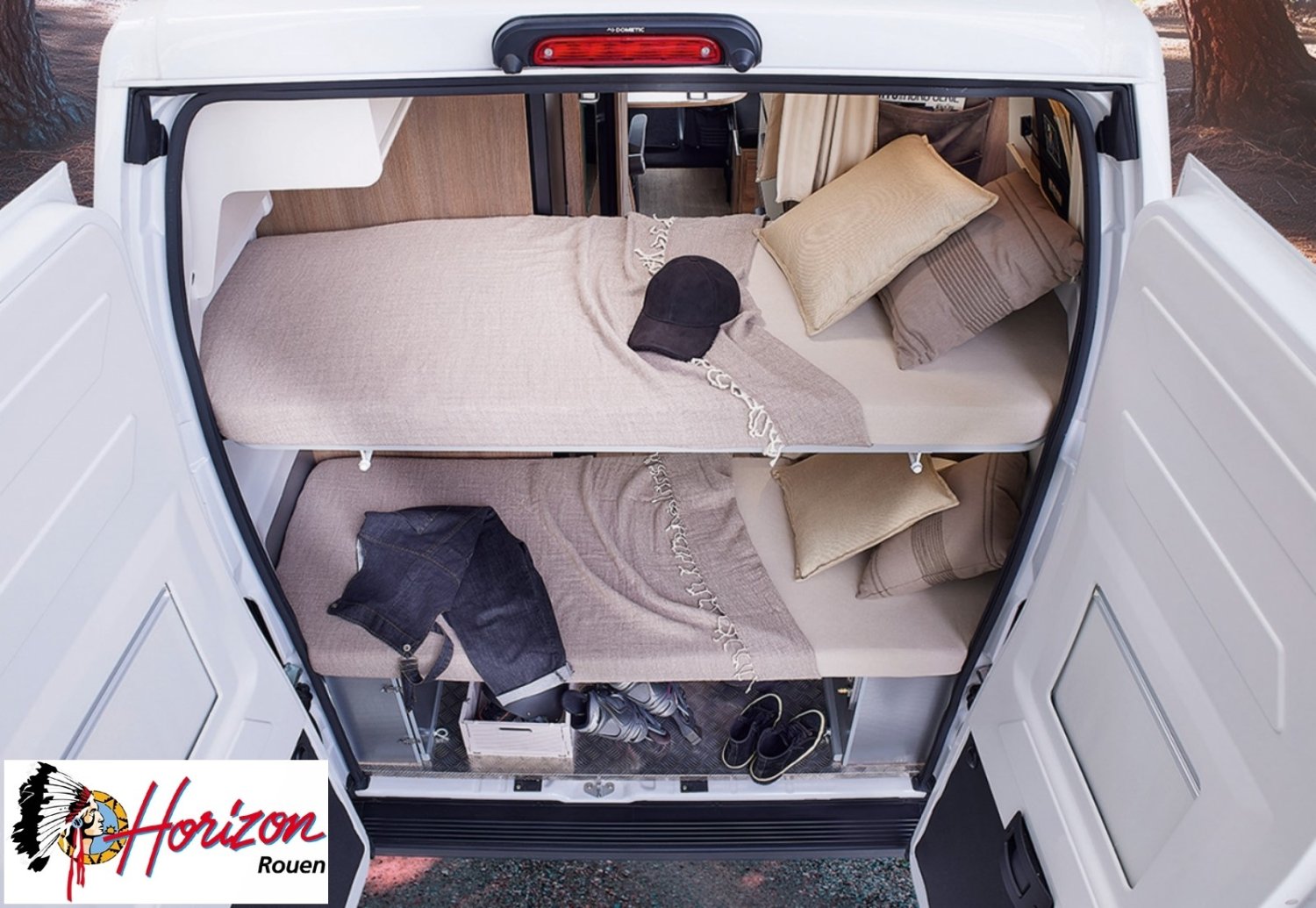 Sa salle de bain DUO’SPACE exploite intelligemment chaque centimètre pour un confort optimal au quotidien, tandis que le double plancher technique offre des rangements astucieux pour toute la famille. Le lit pavillon assisté par vérin se déploie facilement, libérant un véritable espace de vie en journée.
