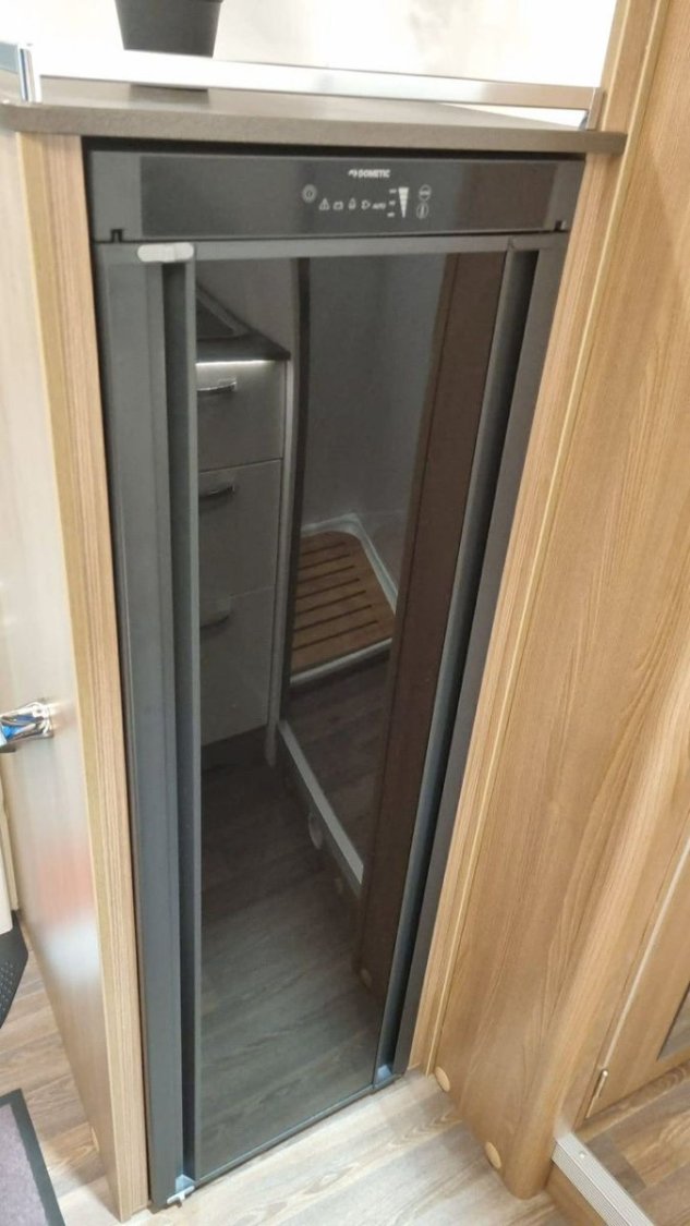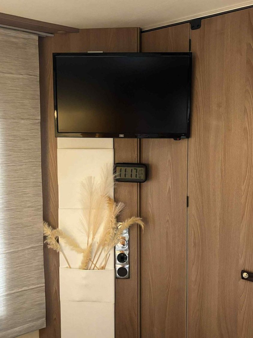 Côté équipements, il comprend un réfrigérateur 133 L, un store extérieur avec LED, un marchepied électrique, un porte-vélos 3 vélos, ainsi que deux Smart TV connectées Oyster, une antenne Wi-Fi, une station multimédia Pioneer avec caméra de recul, Bluetooth et prises USB.