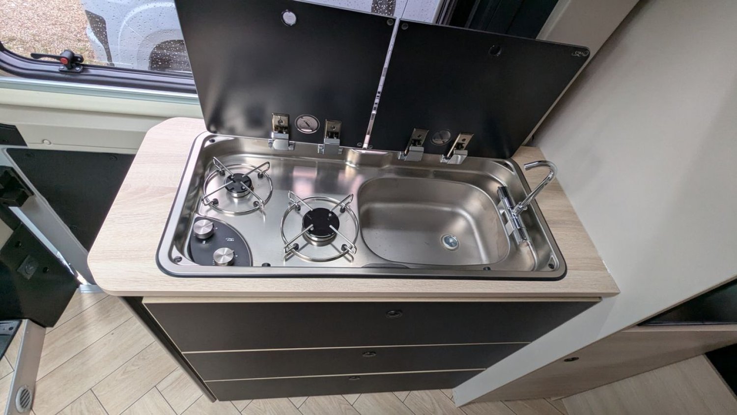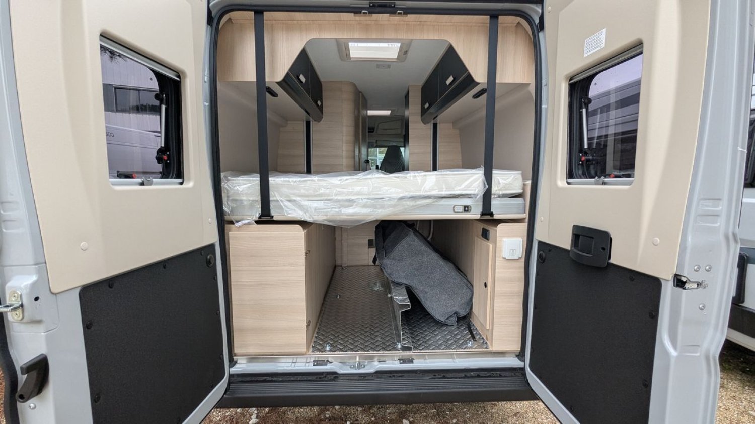 – Pack Accessoires / Store ext, panneau solaire 200w, éclairage Ext, moustiquaire porte latérale, store interieur de cabine, complément couchage dinette.