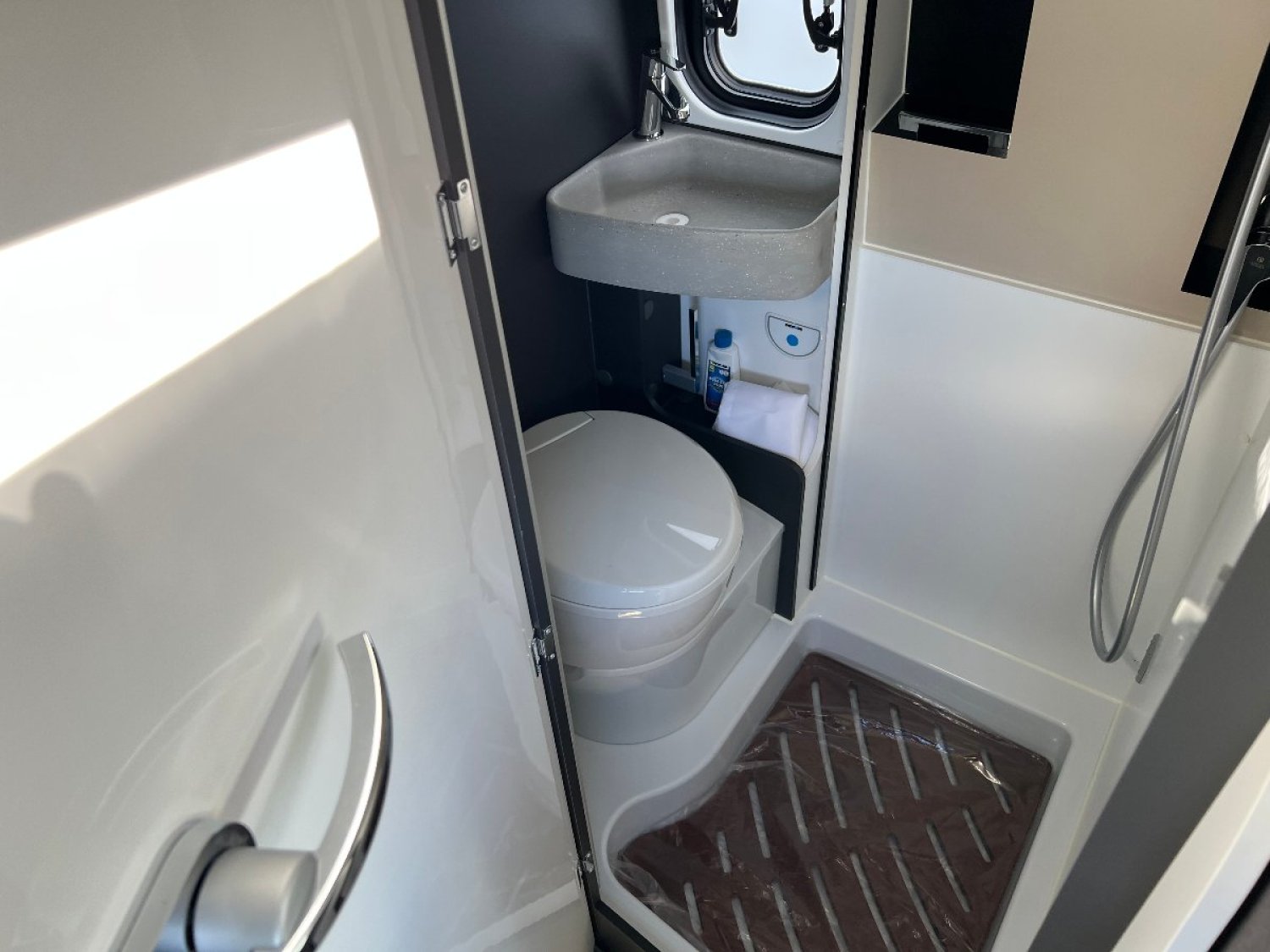 Porte de douche rigide et caillebotis bois.