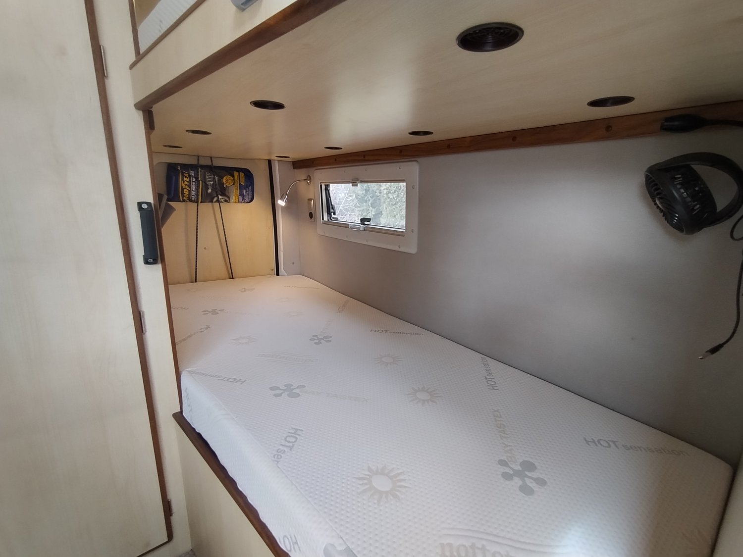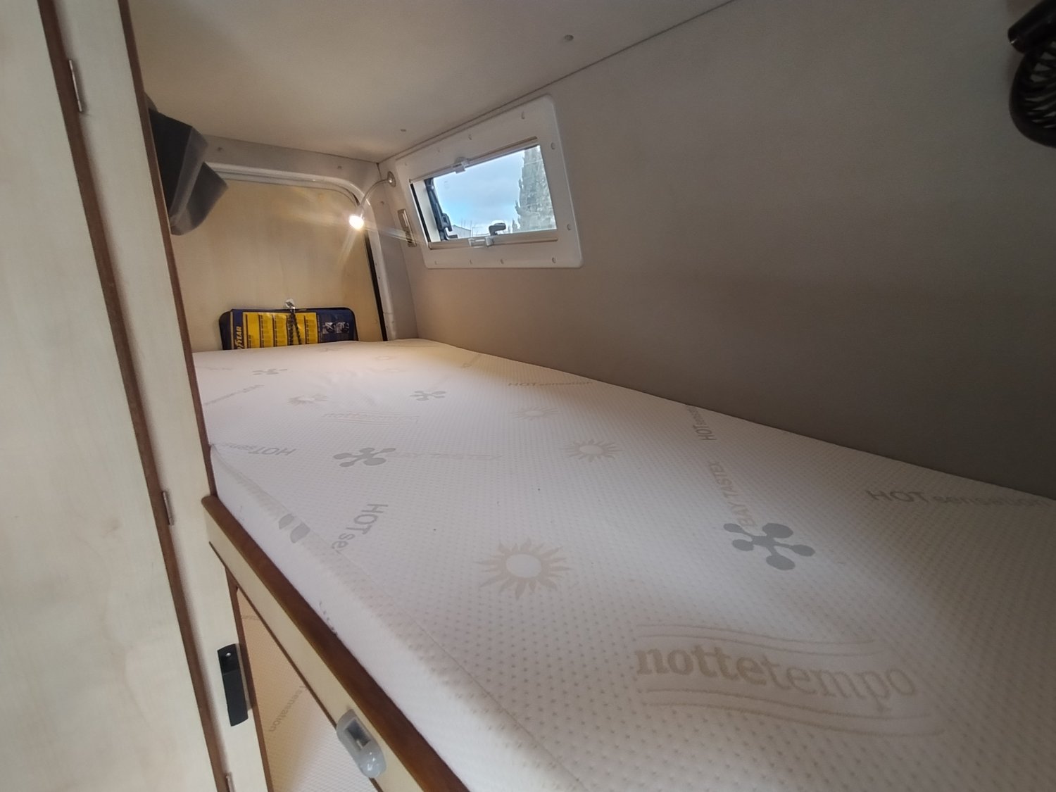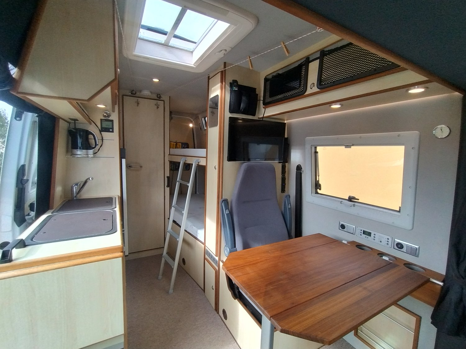Son aménagement idéal pour un couple dispose de tout ce que l’on peut attendre en termes de confort ; 2 confortables couchages en lits superposés, espace salon convivial et lumineux en partie avant, cuisine avec grand frigo à compression et de nombreux rangements, espace SDB et WC indépendant.