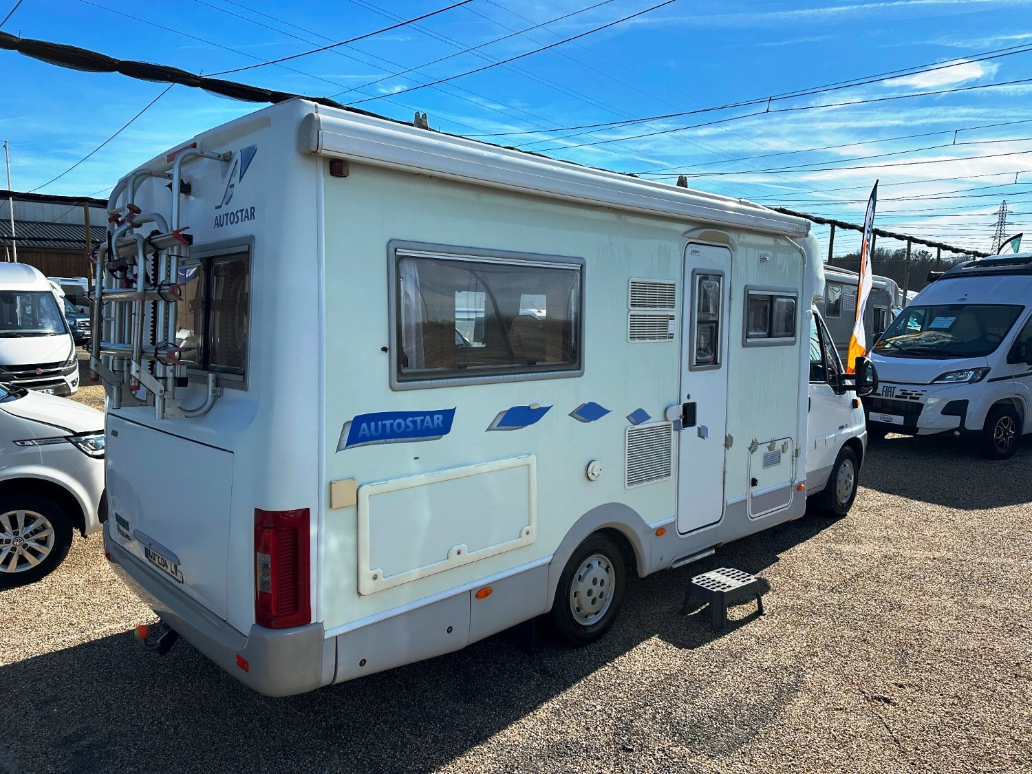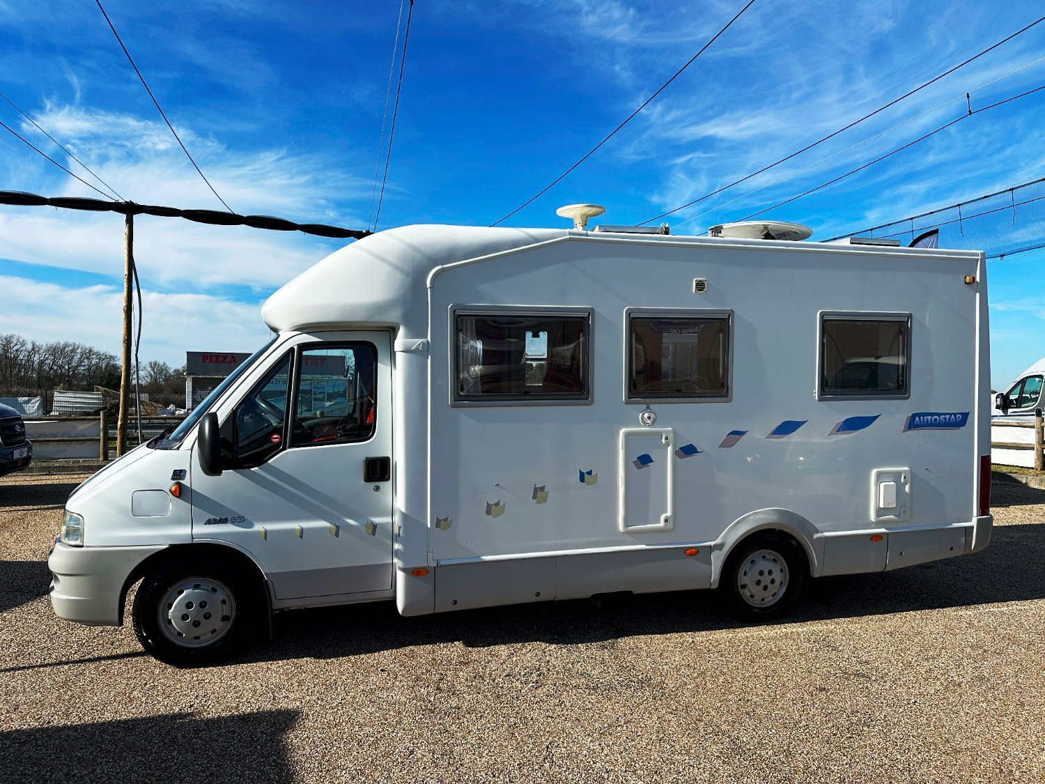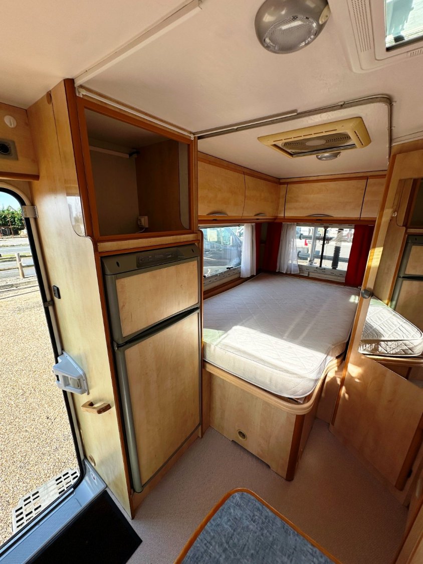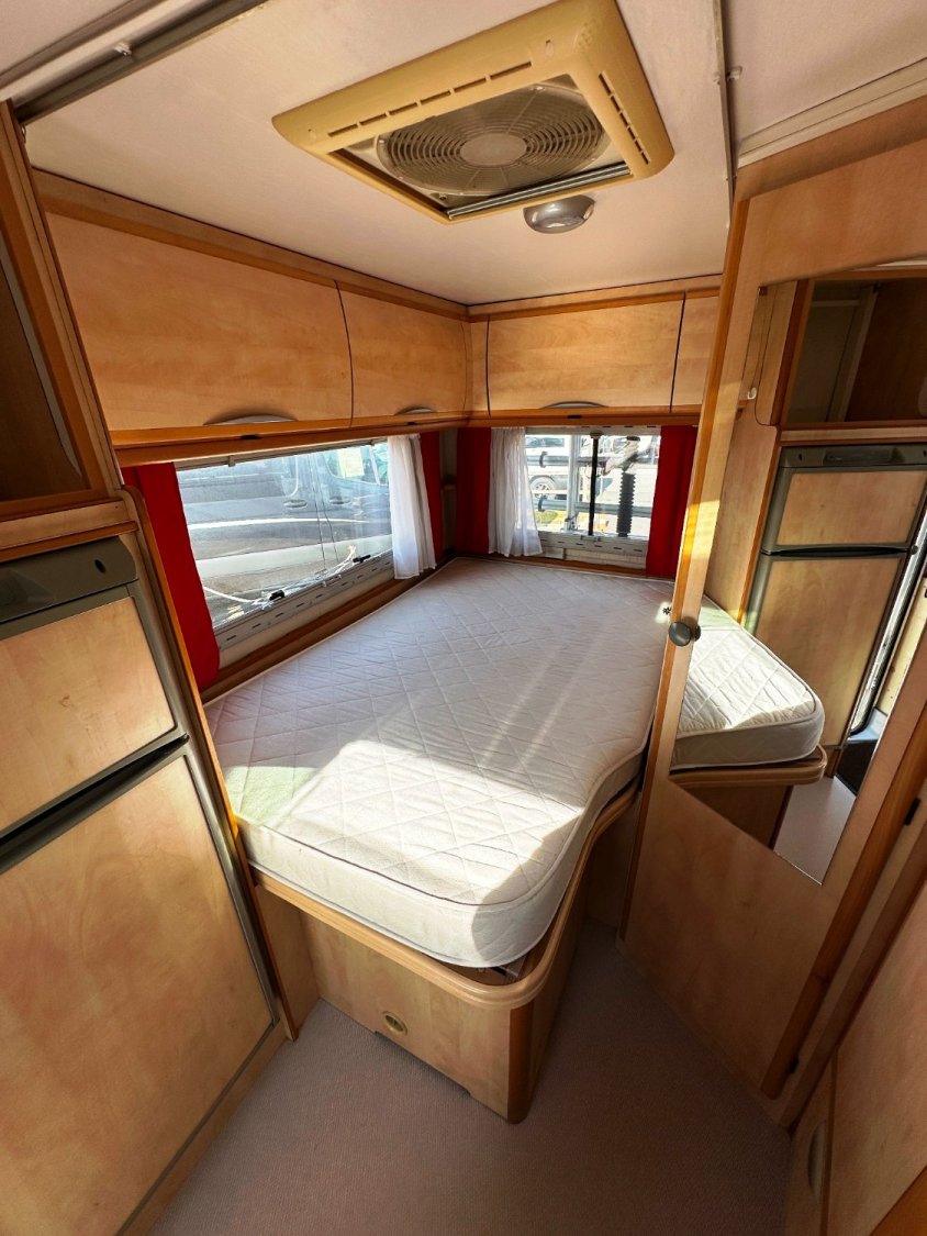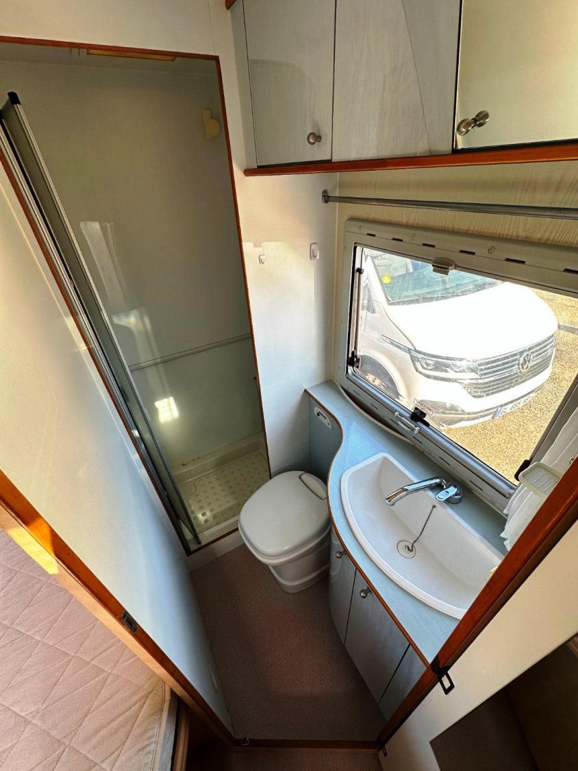 Profilé Autostar, 4 couchages, lit à la Française, salle de bain avec grande douche entièrement séparée, cuisine spacieuse et toute équipée, vaste salon avant avec sièges pivotant et table centrale convertible en un couchage double d’appoint.