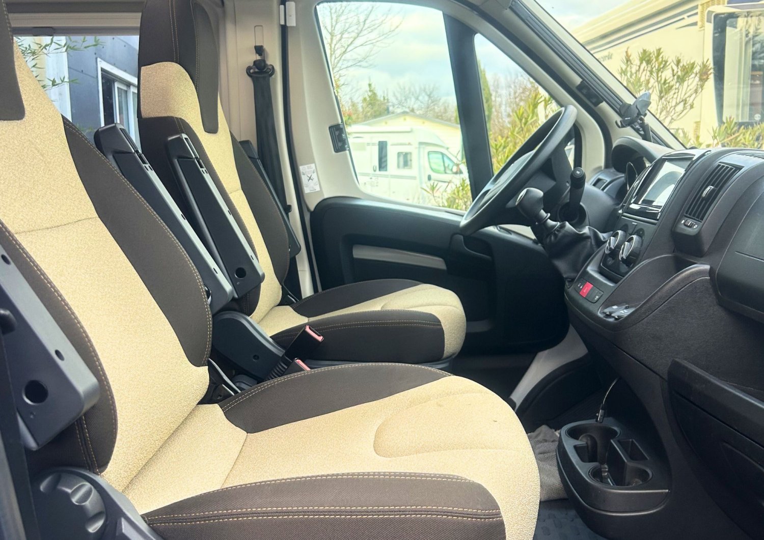 Equipement Couchages : 3 (lit transversal arrière 197 x 150 cm + lit dînette kit fourni) Réservoirs : Eaux propres 100 L / Eaux usées 90 L isolés Chauffage et chauffe eau: Truma Combi 4 au gaz avec commande CP classic Réfrigérateur: 84 litres à compression Smart TV Moustiquaire de porte latéral Marche pied électrique Store plissés cabine Siège et banquette en tissu Lanterneau dans la douche Lanterneau Midi Heki 70 x 50 cm dans salon Caillebotis de douche Panneau solaire Pack multimédia avec Caméra de recul Store extérieur noir
