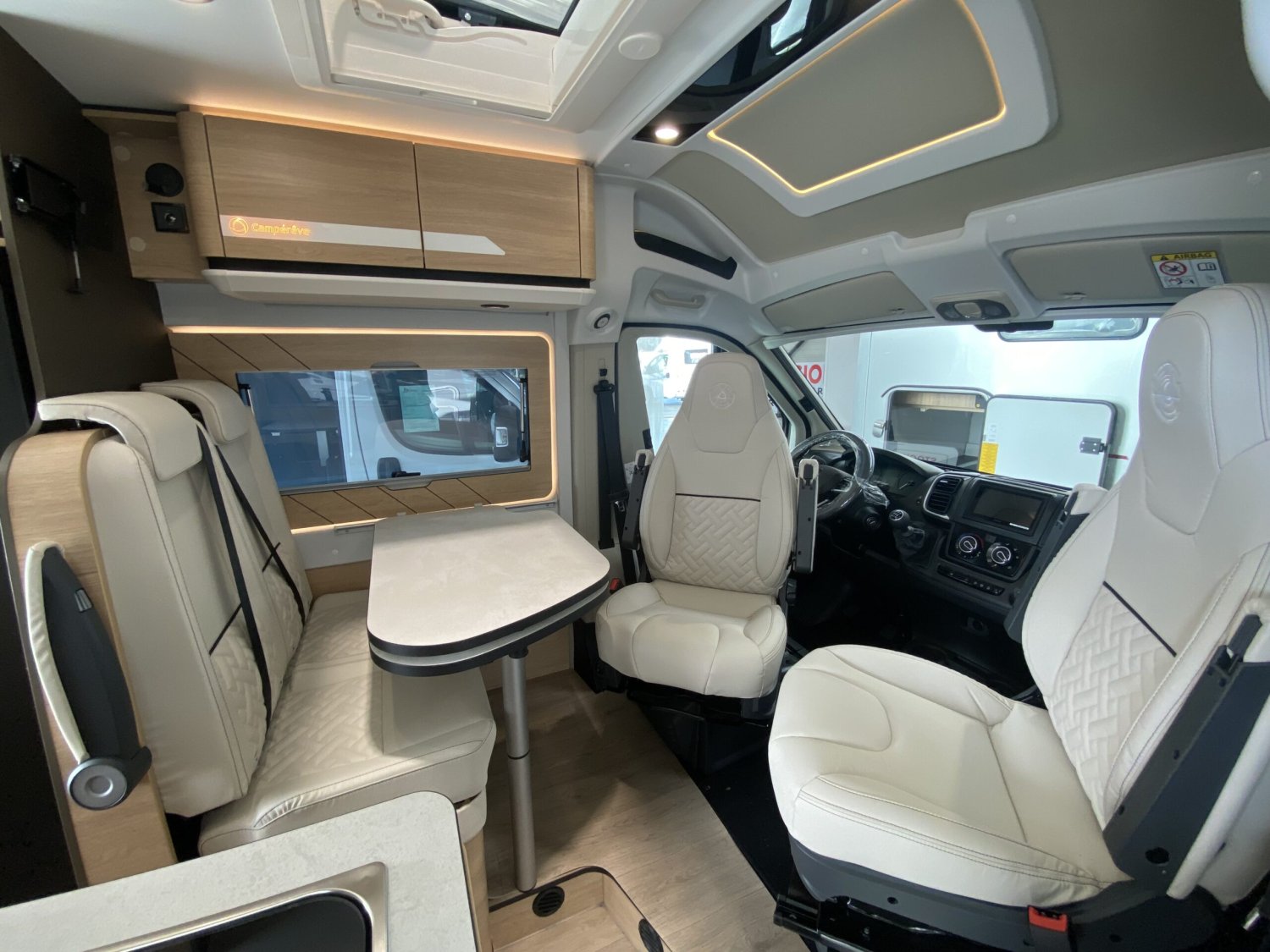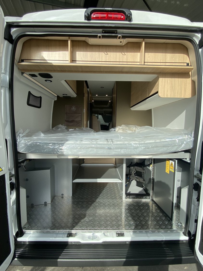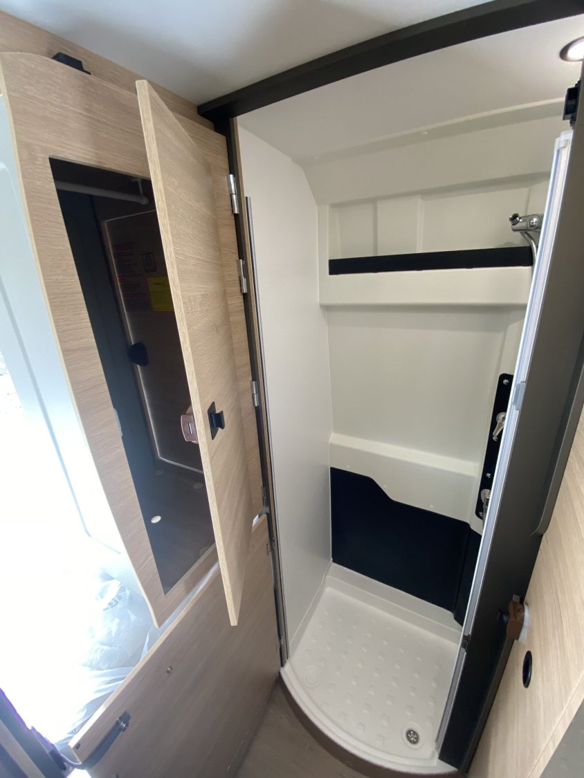 Lit transversal arrière confortableDouche séparée et toilettes séparésPenderie Modul’Space optimisée pour rangement et espaceRéfrigérateur à compression (taille selon version)Chauffage Truma Combi (gaz ou diesel selon configuration)Douches et WC intégrésVerrouillage centralisé des portes cabine et celluleRégulateur de vitesseMarchepied électriqueJantes aluminium (de série ou selon options)ESP, ABS, traction+Stores plissés de cabineMoustiquaire de porte celluleBaies à cadre aluminium avec cadres ouvrantsToit panoramique SkyView en option sur certains modèles (selon configuration)Prises USB/12 V et 230 VPanneau solaire (selon configuration)Direction assistéeÉquipements inclus avec Pack Confort +Commandes au volant pour la radioPneus all seasons 3PMSFPorte moustiquaire ouvrant latéralHaut-parleurs salon et chambre avec commande radio déportéeStation multimédia DAB Pioneer avec Apple CarPlay / Android AutoCaméra de recul avec écran intégré au tableau de bordDeuxième clé télécommandée (PLIP)Hill Descent Control (aide à la descente)Stores pare-brise et baies cabine plissésDouchette extérieure avec eau chaude / eau froideÉquipements inclus avec Pack SmartJantes 16 " en alliage léger bi-tonVolant cuirHabillage gris sur aérateurs