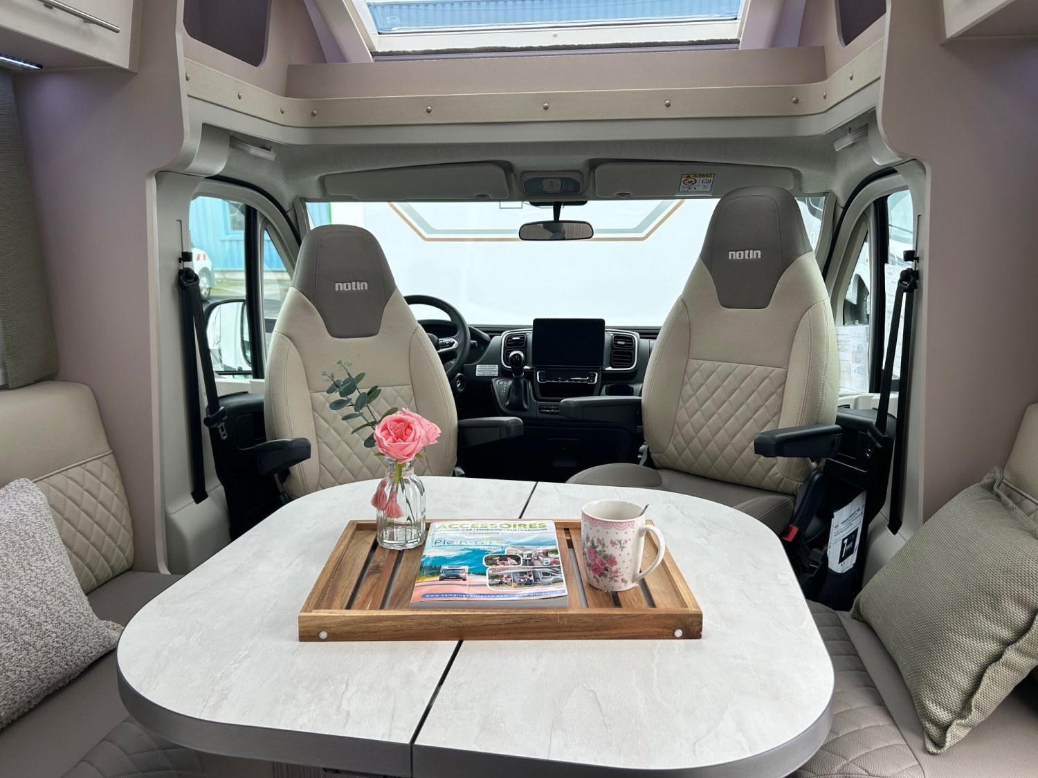 La cellule bénéficie d’une sellerie simili cuir bi-ton, d’une protection de sol et d’une ambiance élégante propre à la marque Notin. Avec ses 6,99 m de long et ses 2,89 m de haut, il reste compact tout en offrant un espace intérieur généreux et bien optimisé.