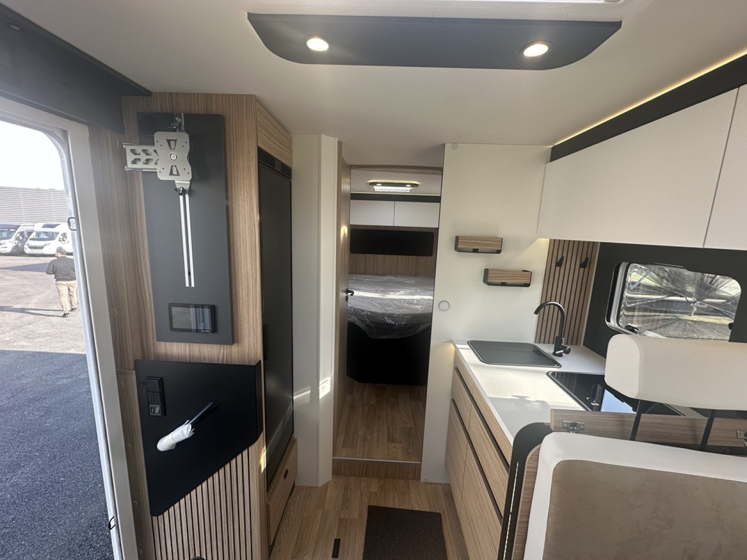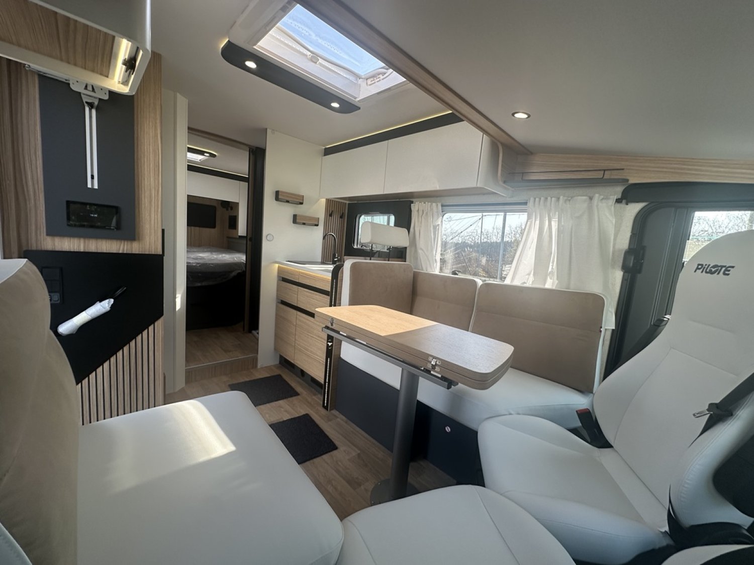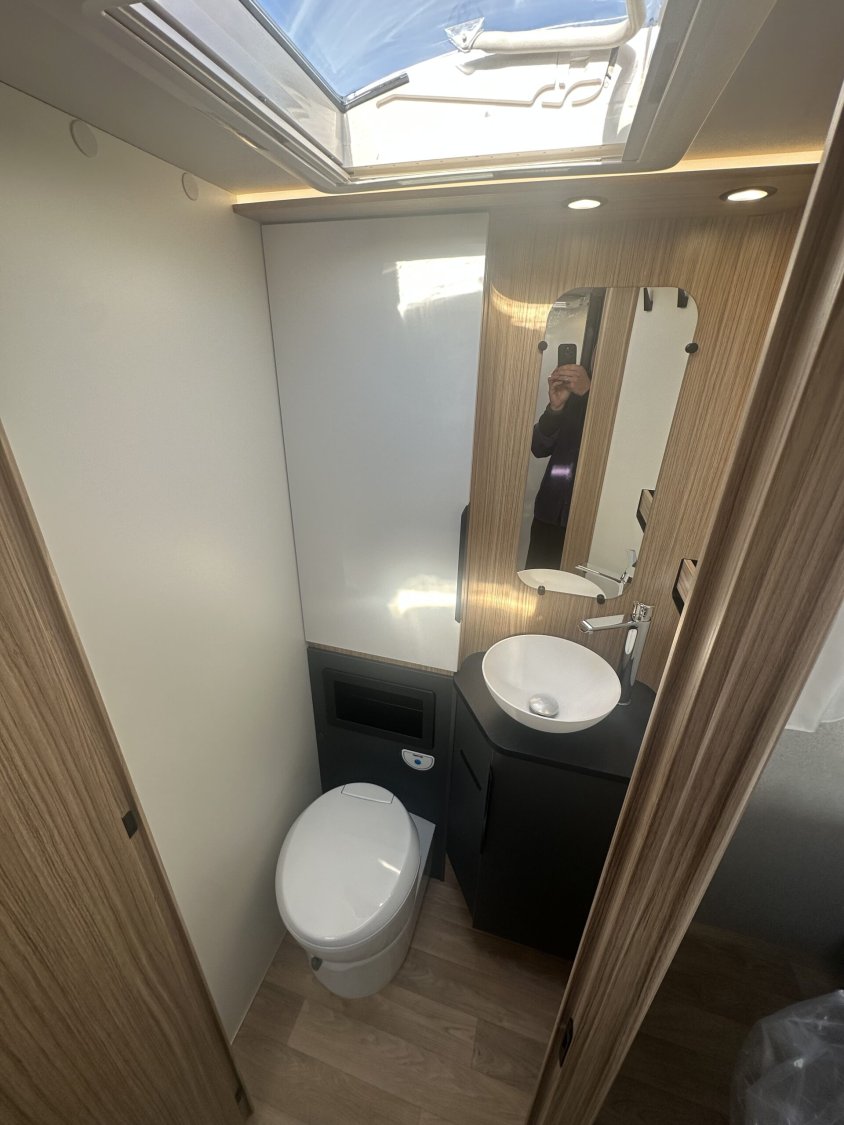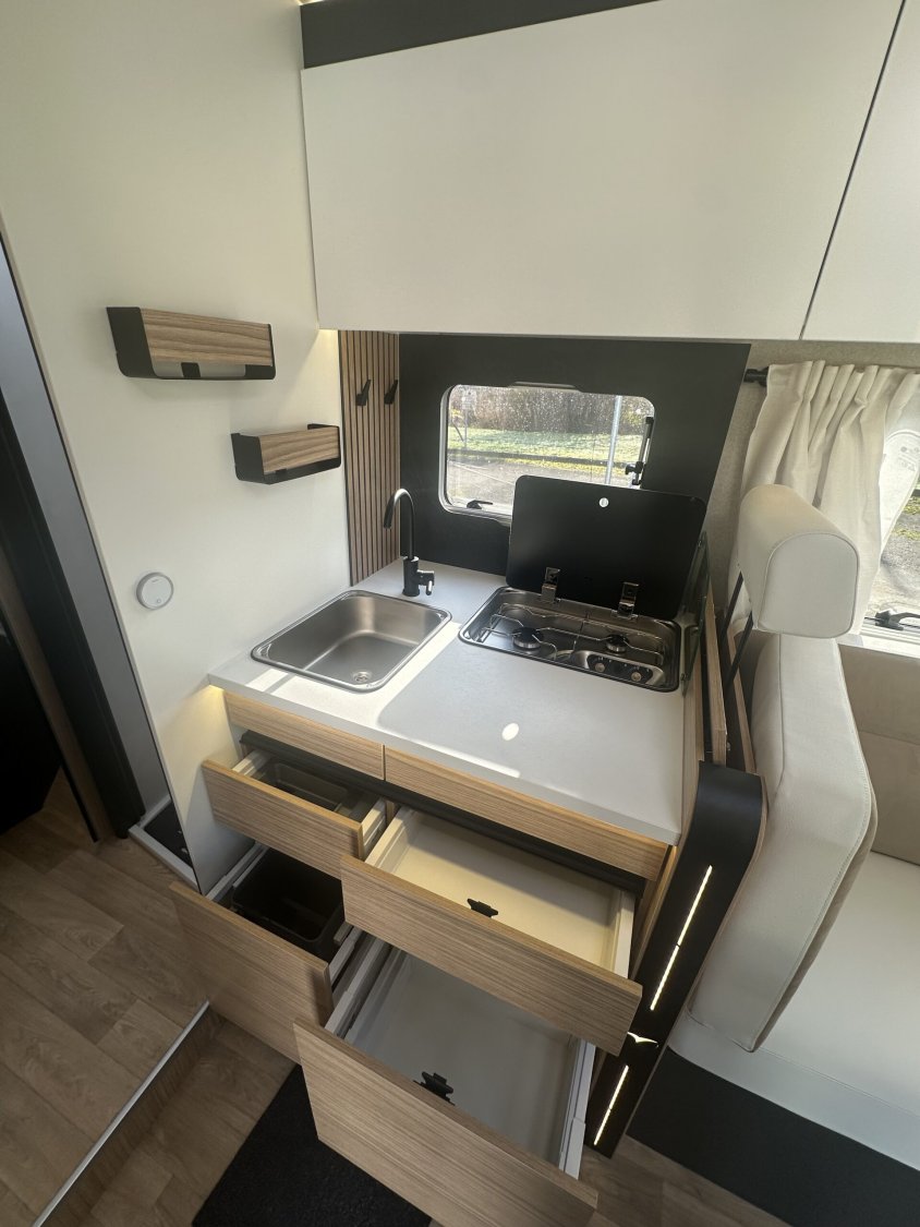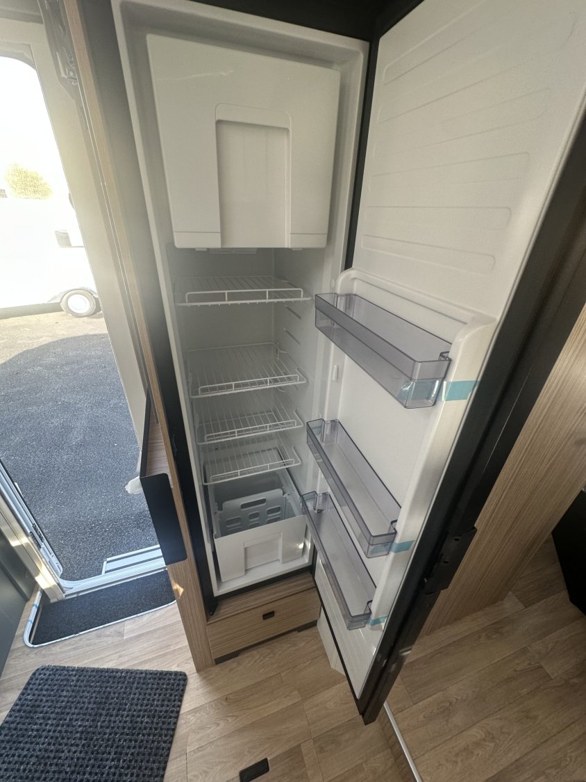 Motorisation 2.2L - 180cv Boite automatiquePack jantes : jantes alliage 16'', volant simili et aérateur gris aluPack média 10'' : autoradio 10'', GPS, DAB, Apple carplay/android auto, caméra de recul, haut-parleurs dans la cabine et la cellule, climatisation automatique, chargeur a induction et tableau de bord digitalBatterie lithium 300Ah et 2 panneaux solaires 210 W monocristallinsConvertisseur 12V / 230V pur sinus 2000WCombi D6E Truma chauffage / boiler 6000w (Diesel/230V)Grand éclairage, rails et prise 230V en souteDouchette eau chaude / eau froide dans la souteTiroir bas de caissePrise gaz extérieurePoubelle intégrée et accessoires pour compartimenterTapis anti-dérapants dans les tiroir cuisineRéfrigérateur a compressionCaillebotis de douchePorte-serviette repliableEclairage dans la penderie de la chambreHousses de draps adaptés aux matelasNouvelle sellerie bi-ton et bi-matière simili et TissuSoute réglable en hauteur électriquement sous le lit central