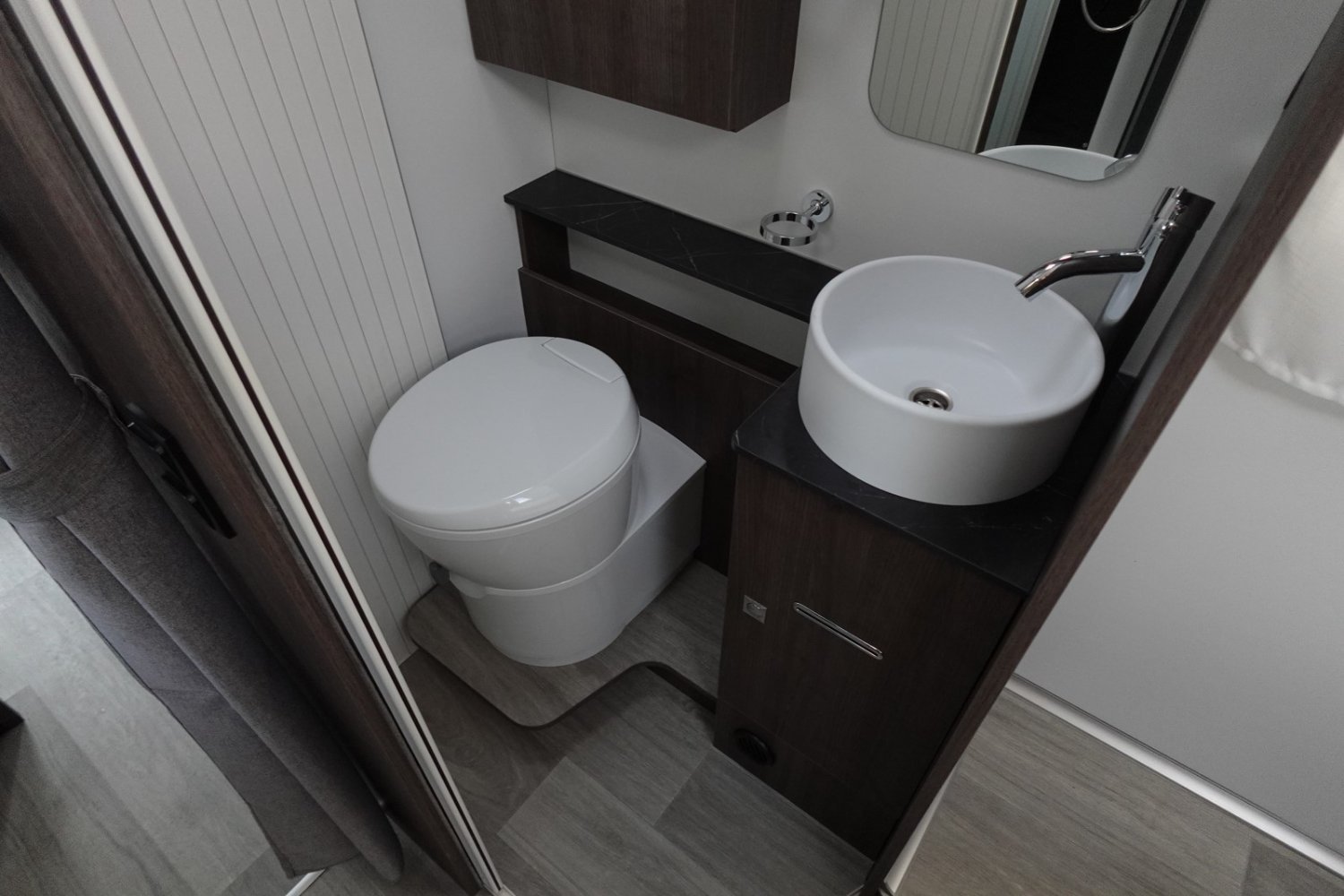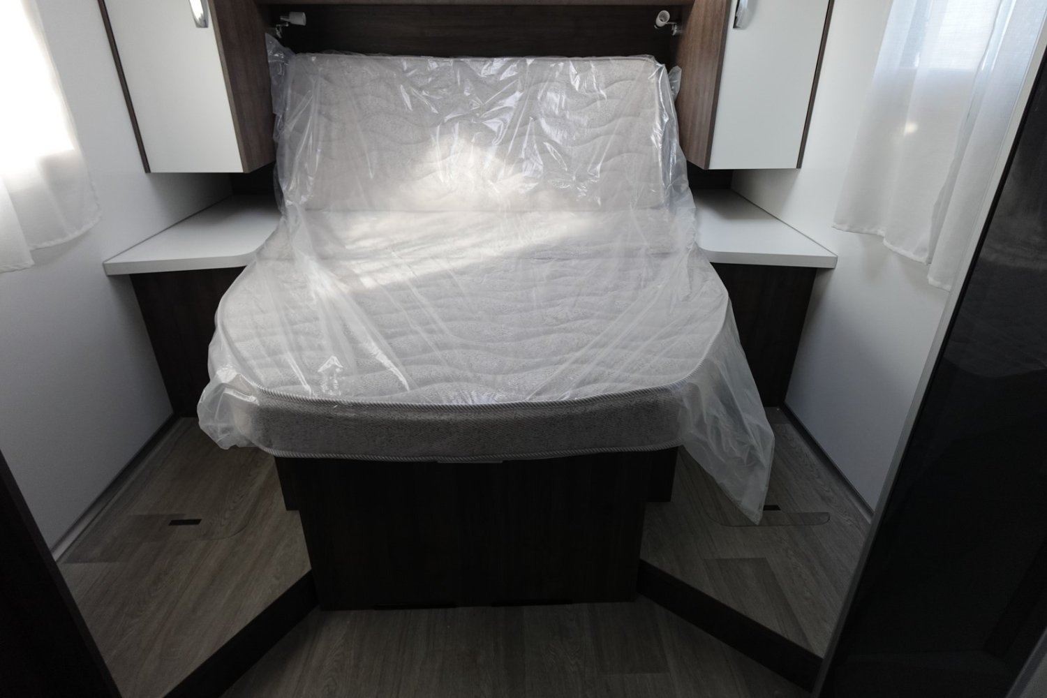 Profilé déjà tout équipé et prêt à partir comprenant un lit central, une douche indépendante de l’espace WC / lavabo, une cuisine en L avec de nombreux rangements, un salon avant panoramique et un lit de pavillon 2 places.