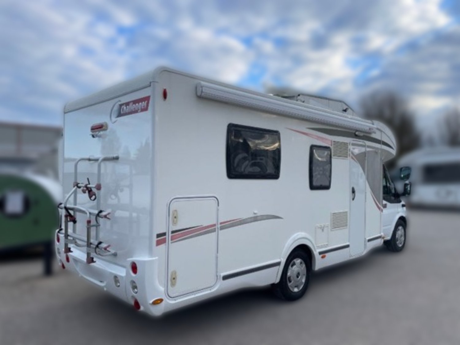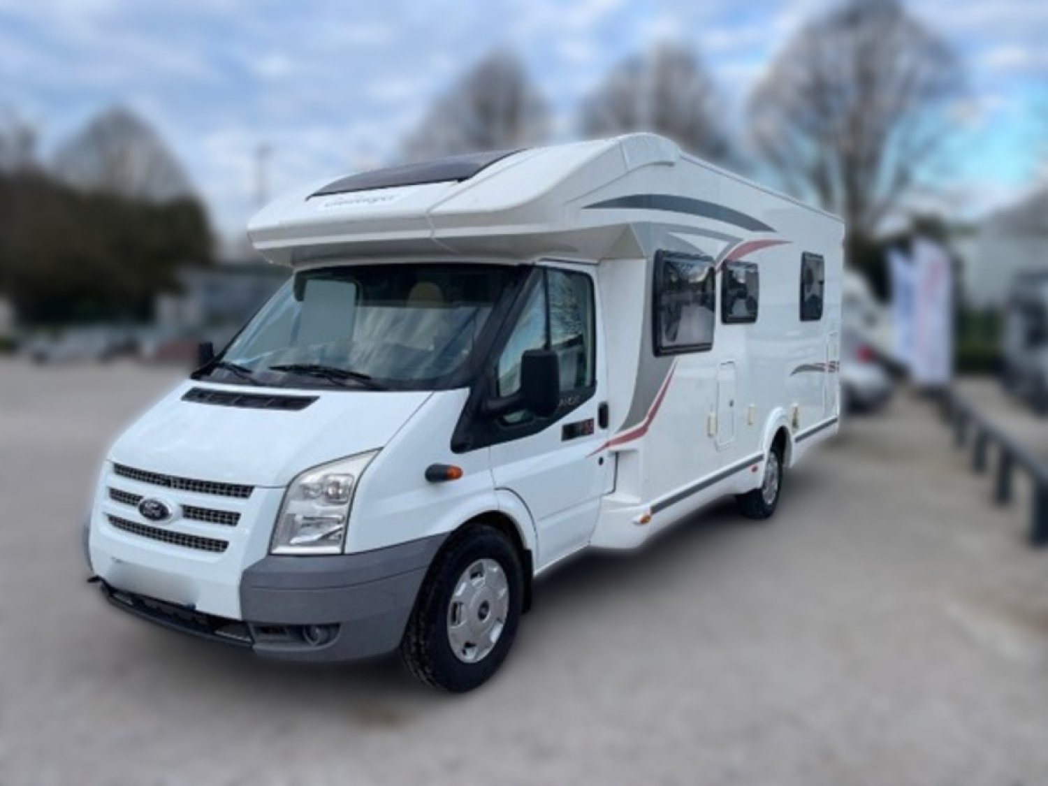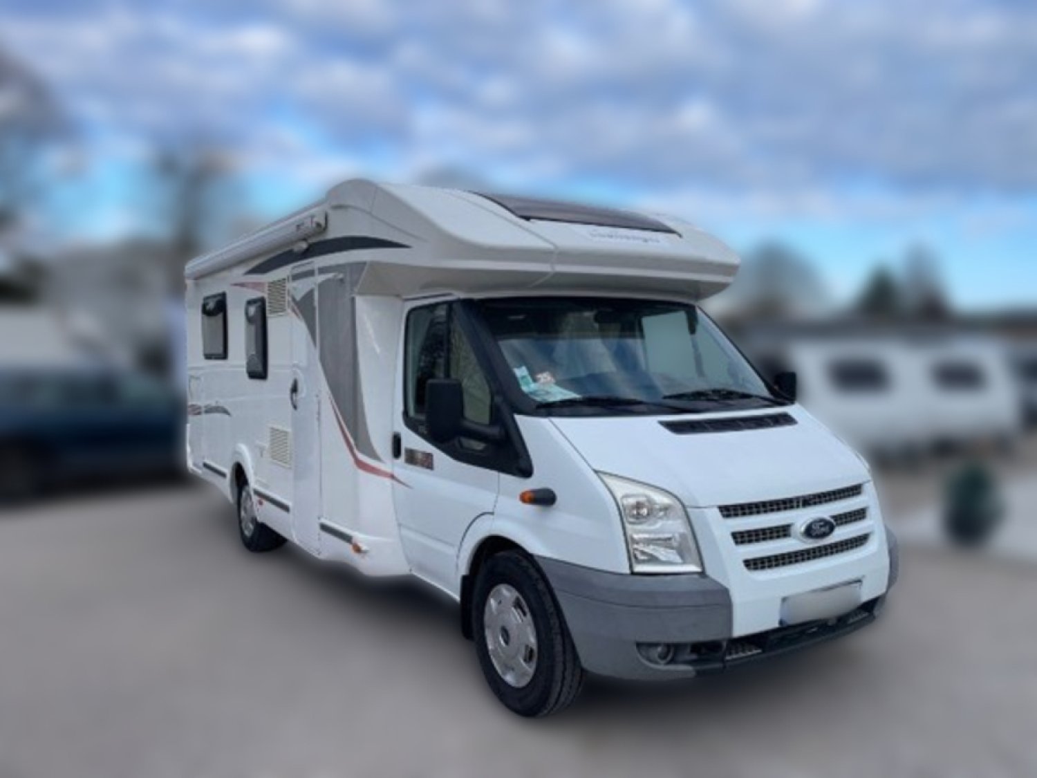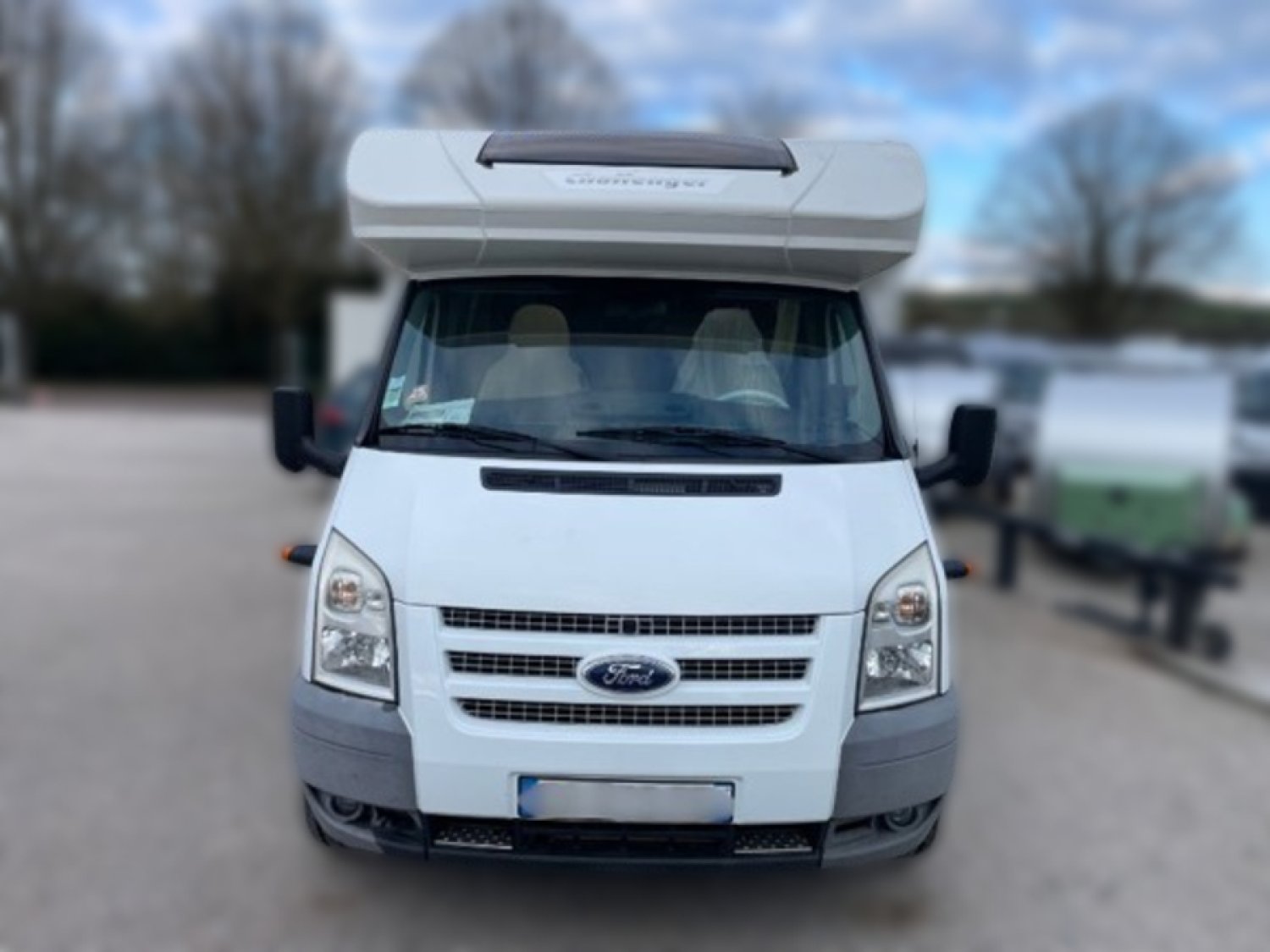 Magnifique camping-car profilé d’occasion Challenger Birthday 58 de 2013 sur Ford Transit 2.2L 140CV, 4 places carte grise et couchage, 7.25 m, bien équipé (Chauffage / Chauffe-eau, Store extérieur, Panneau solaire…).