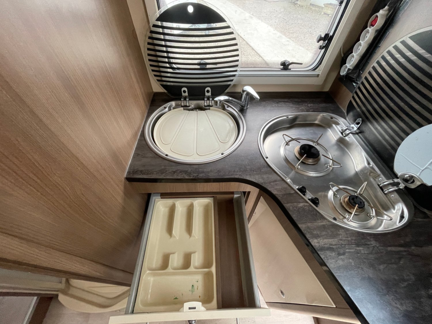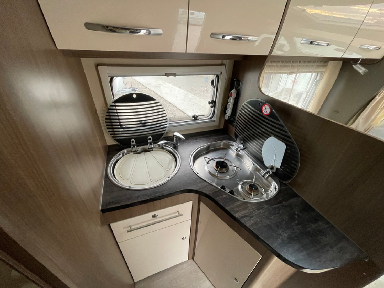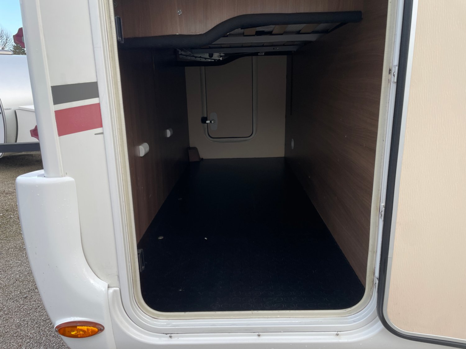 Ce camping-car vous fera bénéficier d’un joli coin dinette transformable en couchage supplémentaire, pour passer de bons moments en toute convivialité. Vous profiterez également d’une cuisine pratique et fonctionnelle avec un réchaud 2 feux, évier inox, couvercles en verre et un grand réfrigérateur congélateur de 145L. Il possède aussi un coin salle de bain avec WC à cassette, lavabo, miroir et une grande douche indépendante. A l’arrière, c’est un lit central avec porte d’intimité et penderie pour passer de belles nuits agréables et confortables. Sans oublier ses nombreux rangements astucieux et sa grande soute pour emporter vos affaires de camping en toute sécurité.