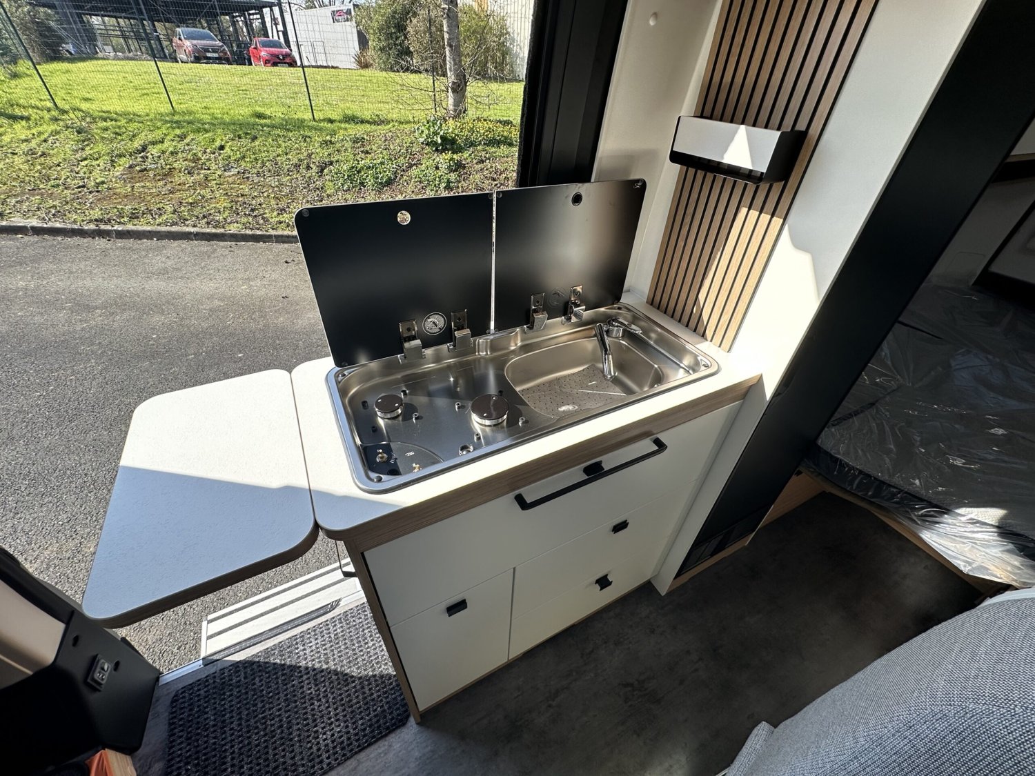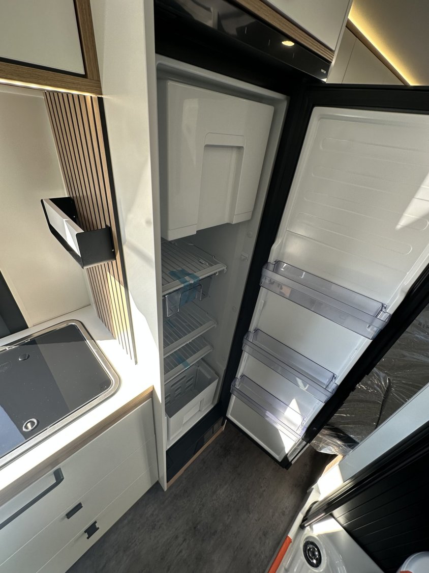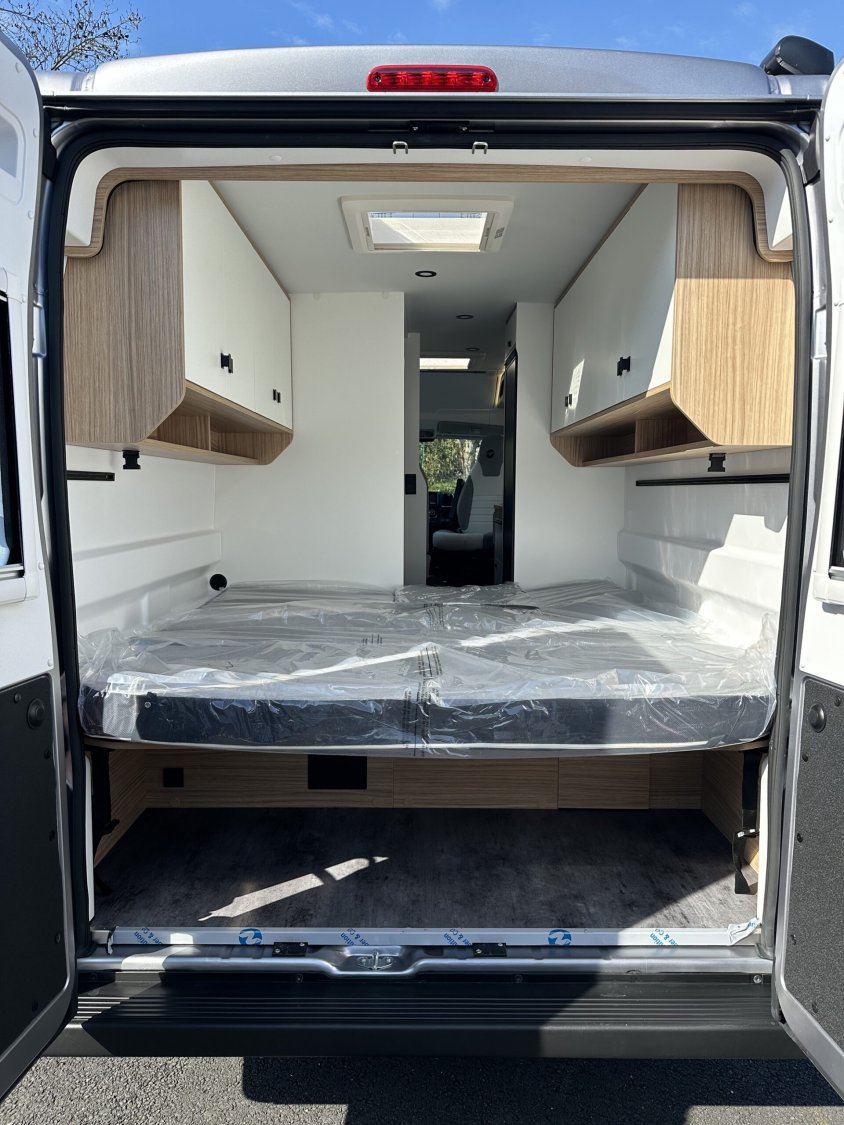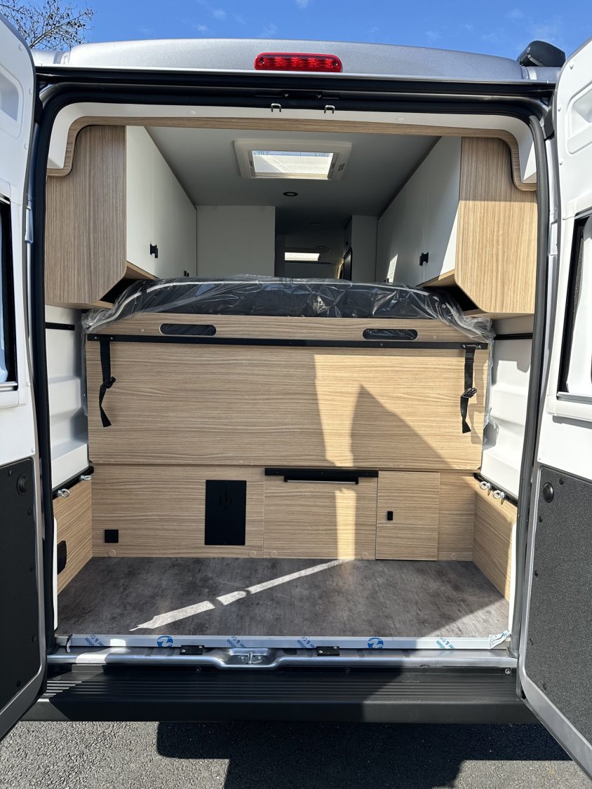 4 places carte griseSalon avant avec sièges cabine pivotantsGrand lit arrière modulable jusqu’à env. 200 × 200 cmPossibilité de couchage transversal ou lits jumeauxCouchage supplémentaire dans le salon avantCuisine équipée avec évier et plaque de cuissonRéfrigérateur à compression 138 LCabinet de toilette central avec doucheBatterie lithium 200 AhBooster de charge 40 ADeux panneaux solaires extra-platsChauffage Truma dieselRéservoir eaux usées chaufféAutoradio Pioneer 7″ DAB avec Apple CarPlay et Android AutoCaméra de reculJantes alliage 16″Volant simili cuirSellerie premium tissu / similiStore extérieurDouchette eau chaude / eau froide dans la souteFixations IsofixÉclairage LED intérieur et extérieurNombreux rangements et soute modulable