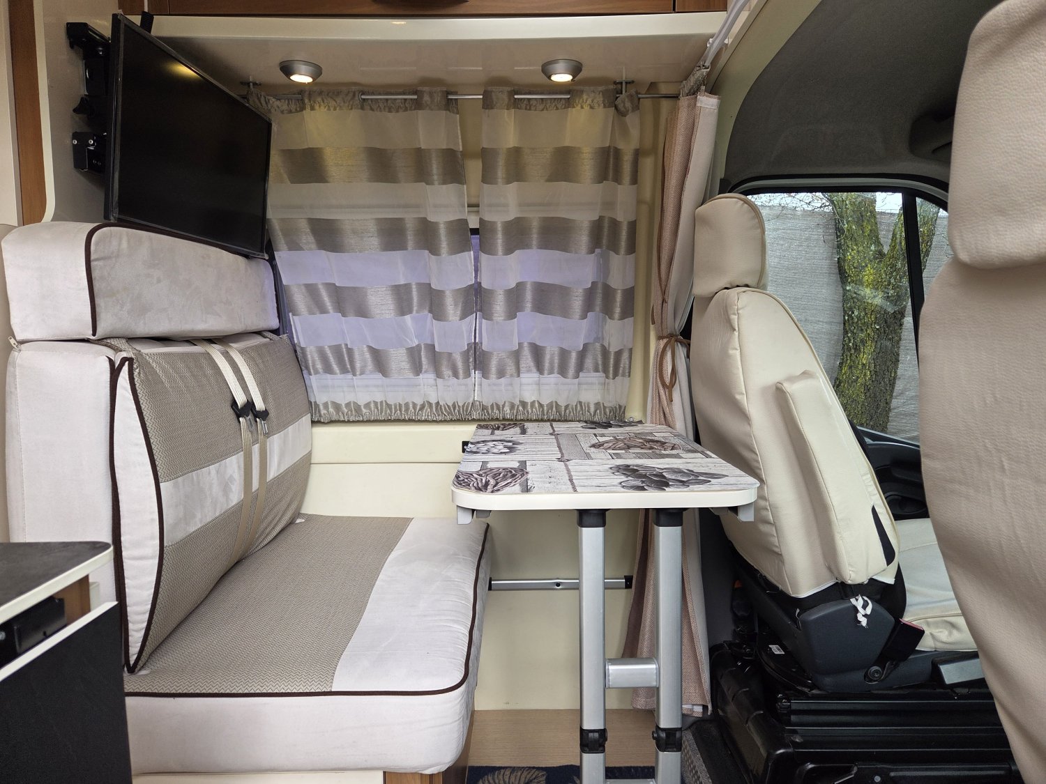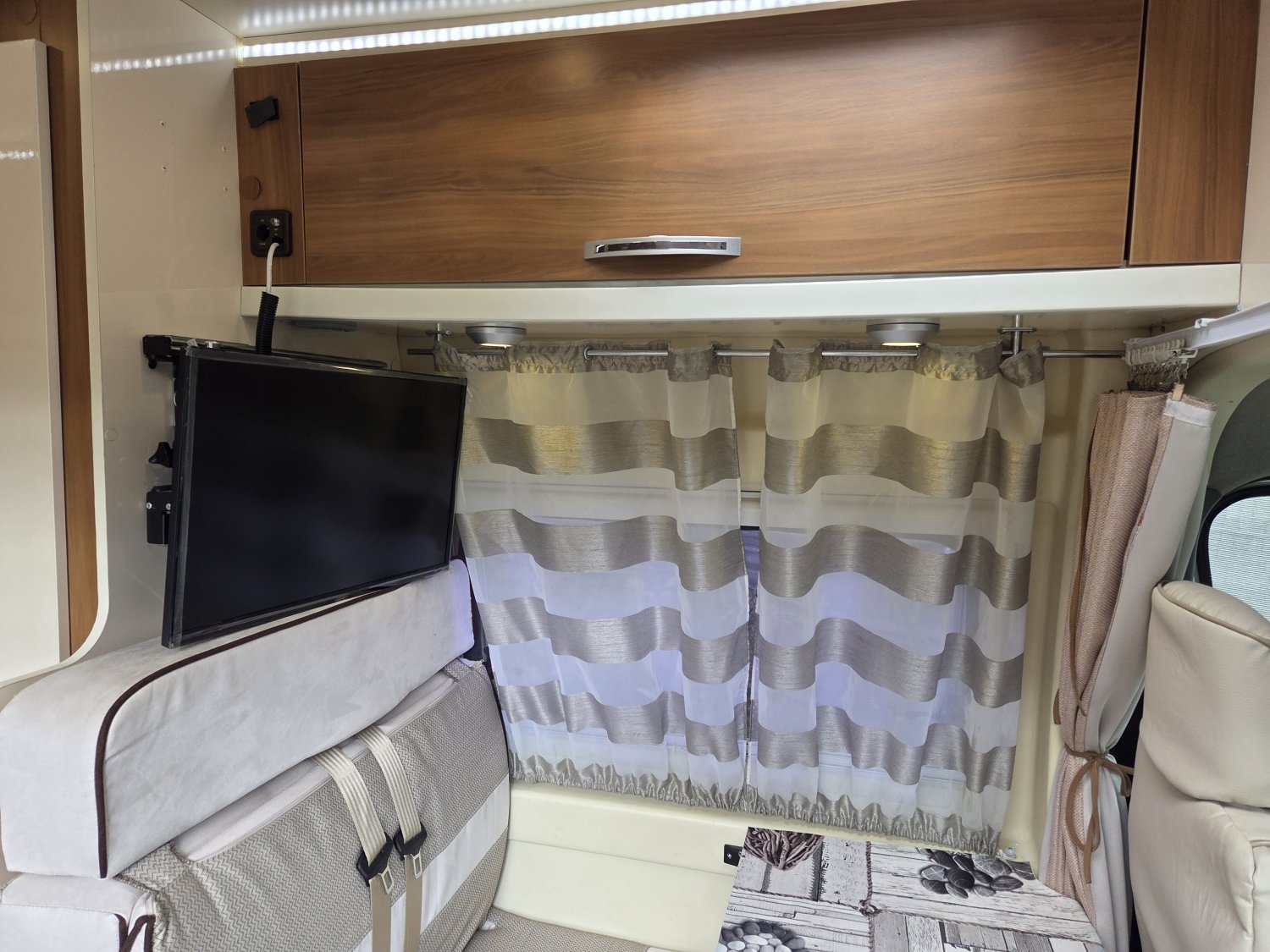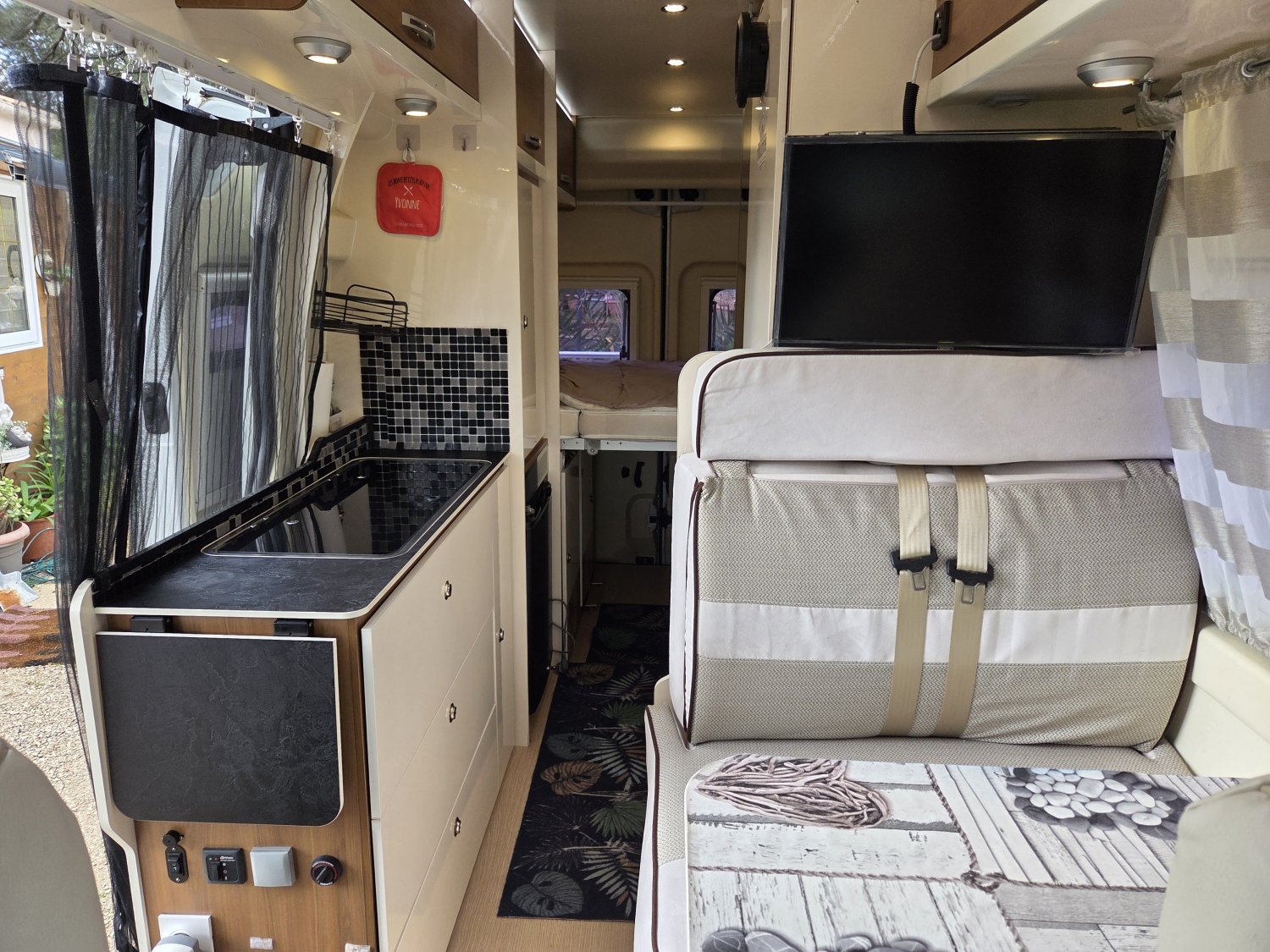 CHAUFFAGE CARBURANT, STORE EXTERIEUR 3M, GAZINIERE 2 FEUX, FENETRE SDB, ECLAIRAGE LED, PORTE VELO, REFRIGERATEUR 12V A COMPRESSION, CHAUFFE-EAU GAZ