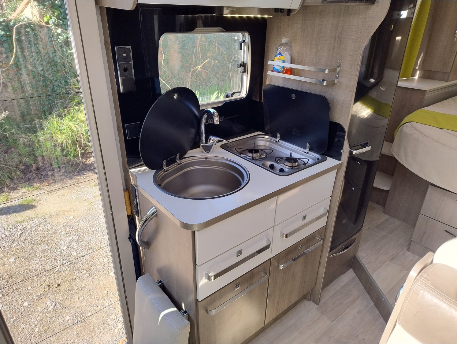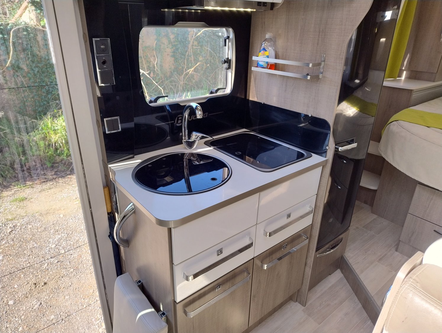 Une implantation idéale et très confortable pour un couple : lit central permanent avec nombreux rangements, kit dinette disponible pour un 3° couchage en partie avant. Cuisine toute équipée, salon spacieux et très lumineux, espace douche et WC séparé avec paroi pivotante. Dans l’ambiance « Class » du Bavaria… Le tout complété par une soute traversante de grande capacité adaptable en hauteur.