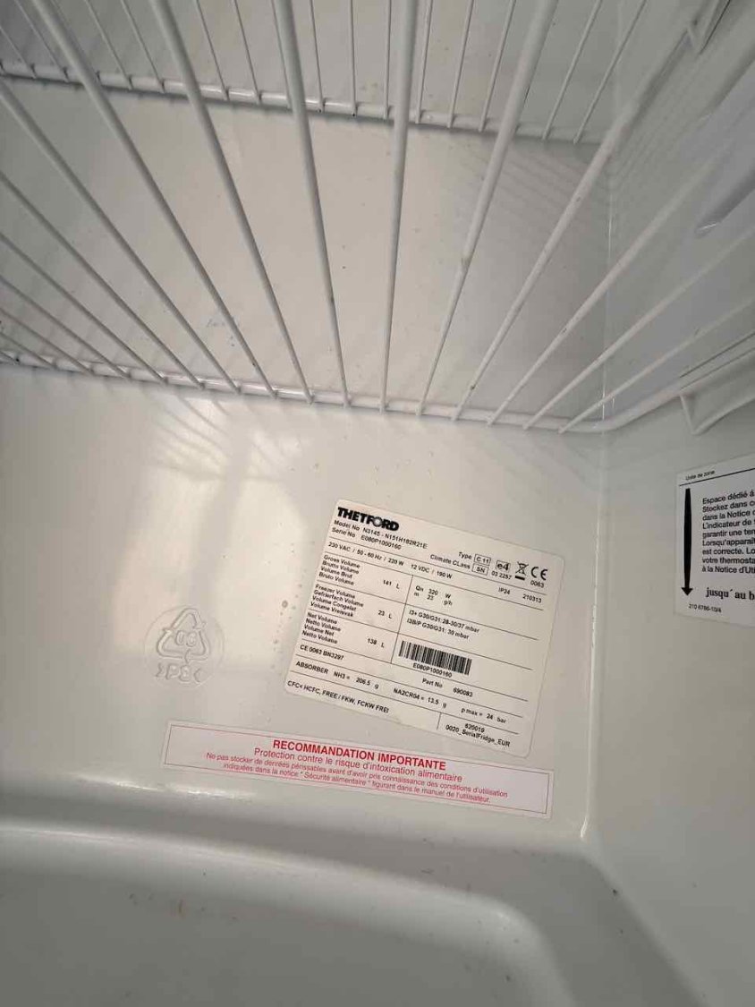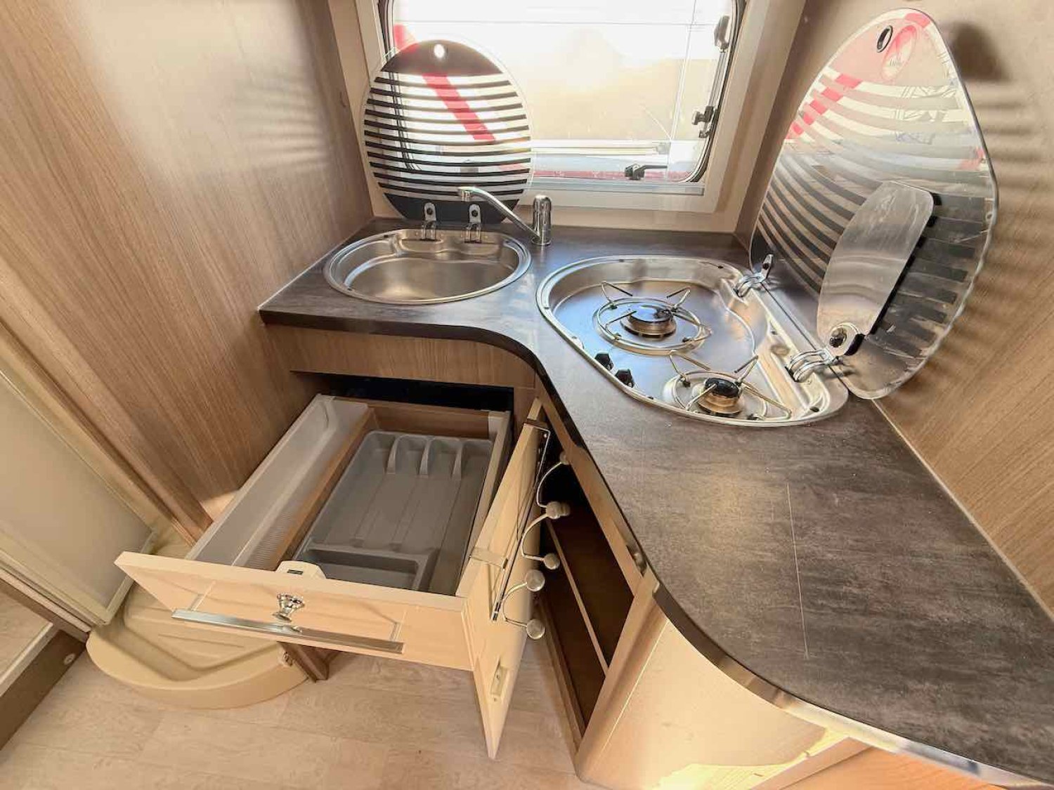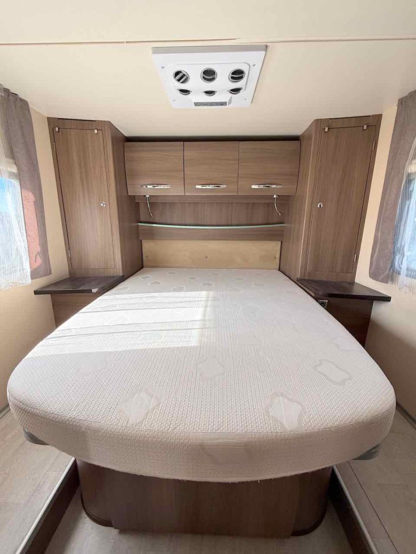 La salle de bain spacieuse, située à l’arrière, dispose d’une douche séparée, de WC à cassette, d’un lavabo et de nombreux rangements.