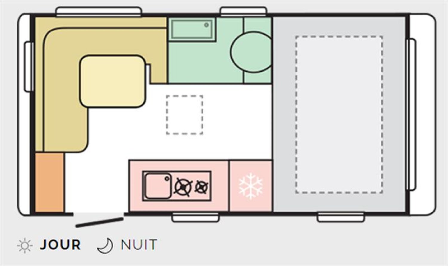 Amortisseurs, Couvre timon, Marche pied amovible, Fenêtres teintées, Réchaud 2 feux, Réfrigérateur 140 L, Chauffe-eau Truma 5L, Réservoir d'eau fraîche 50L, Eclairage LED Auvent, Chauffage gaz Truma, Stabilisateur AKS