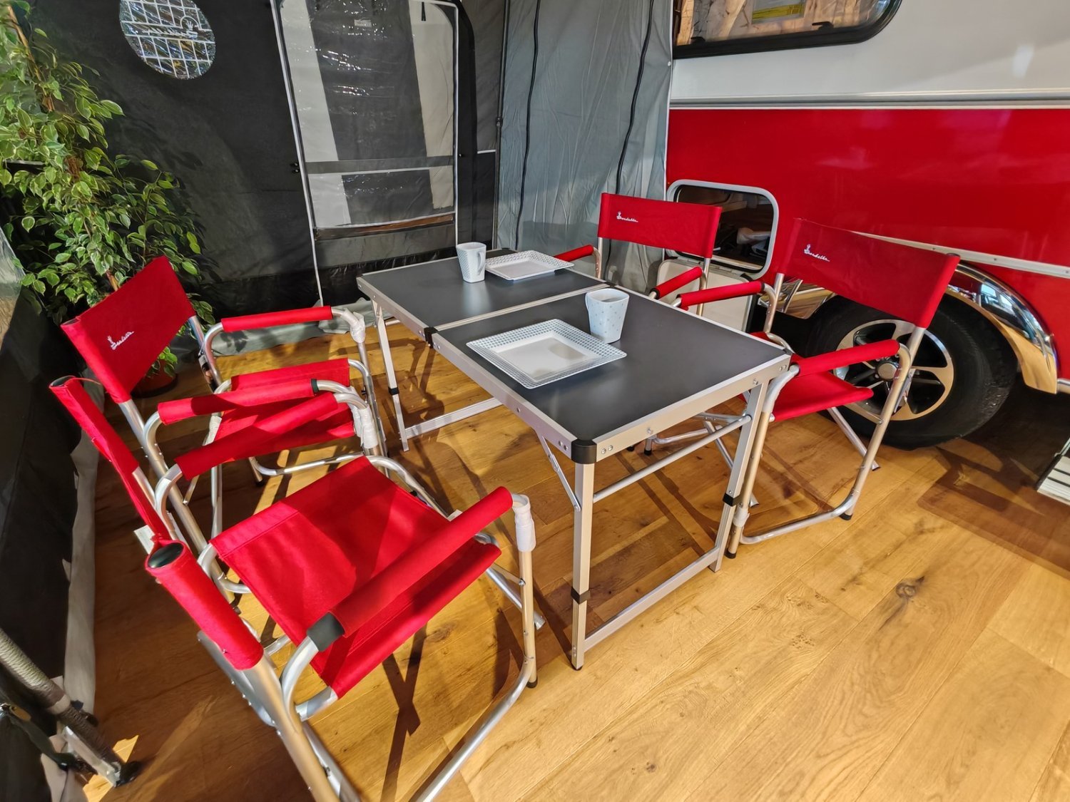 - Pack "Confort Eriba Touring" (moustiquaire de porte cellule, stores plissés confort, prises supplémentaires, couvercle évier avec planche à découper, poubelle intégrée à la porte cellule, miroir grossissant supplémentaire à fixation magnétique),