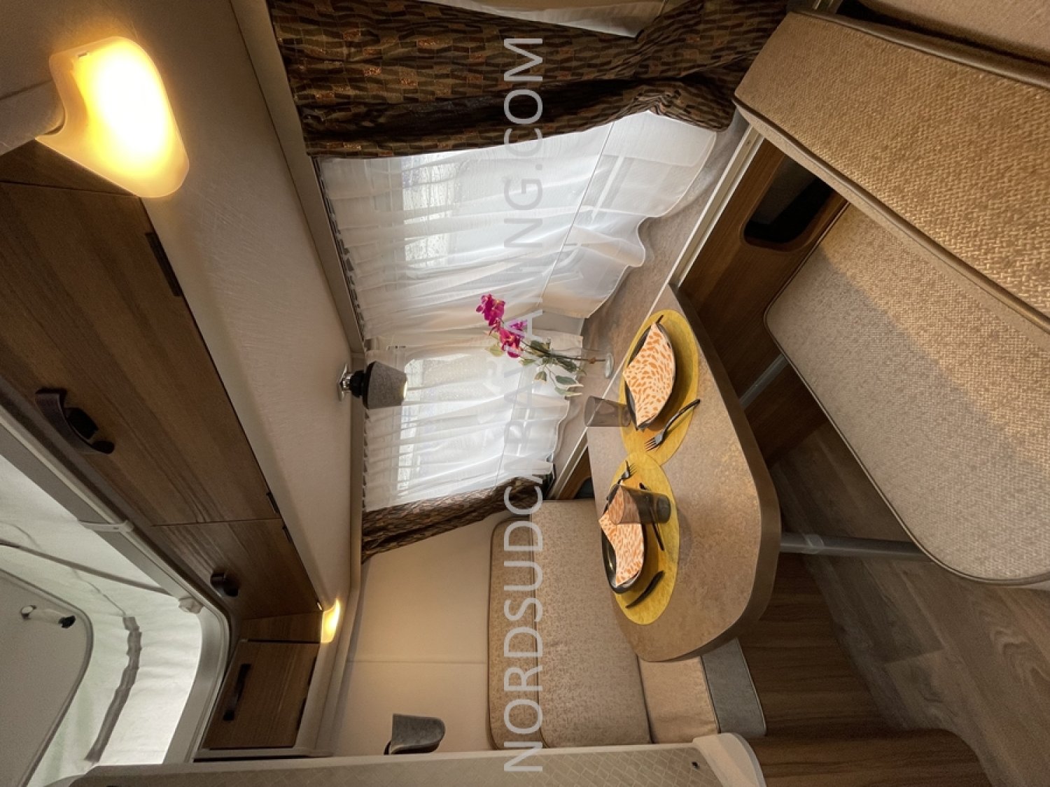 Cette caravane surbaissée très maniable, possède un lit transversal permanent donnant accès à une soute de rangements. Côté cuisine, elle est équipée d'un réchaud 2 feux gaz, un réfrigérateur 12/220/Gaz, un évier inox avec un plan de travail et un plateau de table avec revêtement anti-traces de doigts : moderne et facile d'entretien. Un coin toilette avec lavabo et WC ainsi que de nombreux rangements astucieux (Penderie, placards, trappes…)