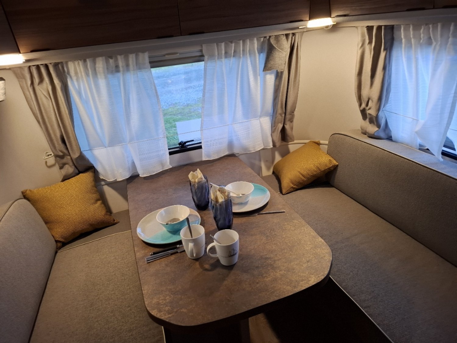 Caravane ERIBA très compacte avec cabinet de toilette, salon transformable en couchage 2 adultes, cuisine à l'avant de la caravane. Elle sera équipée d'un auvent DOMETIC POP AIR TOUR 290 offert pour sa mise à disposition (valeur 1 380 € TTC).