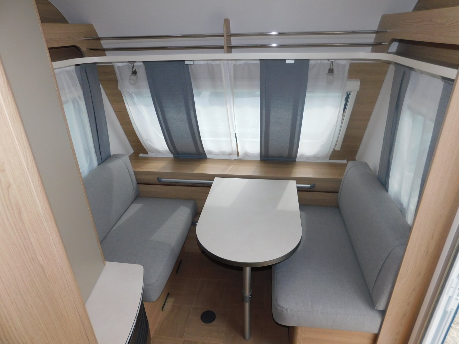 Superbe Salon en Face à Face à l'avant de la caravane avec une grande baie donnant beaucoup de lumière. Table pour manger à 4 personnes. La TV se trouvera sur une paroi à bonne hauteur