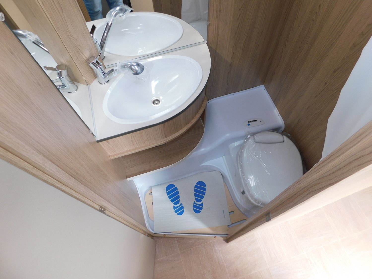 Salle de bain avec cabinet de toilette et douche grâce à l'option Pack Douche présent en option dans la caravane.