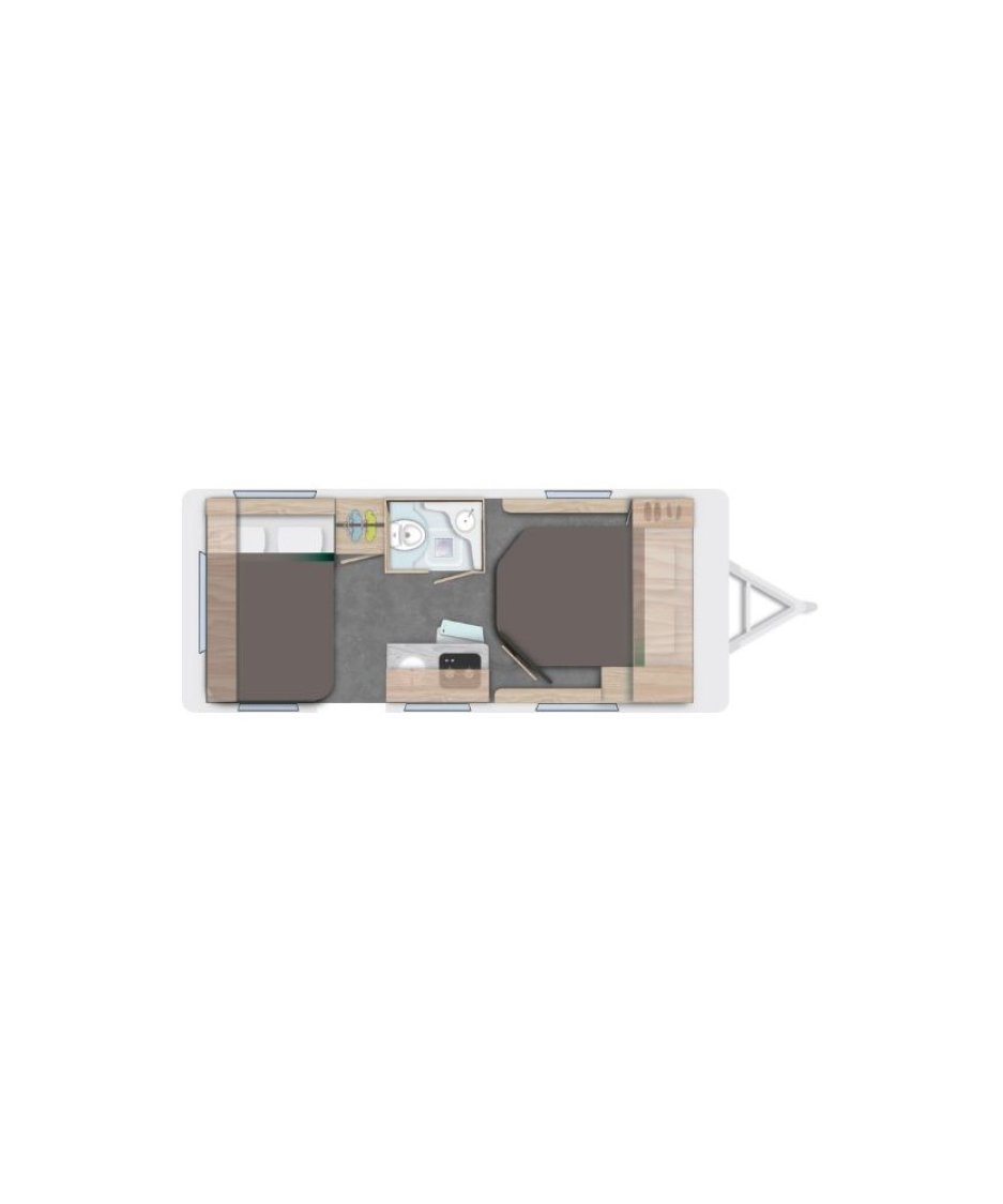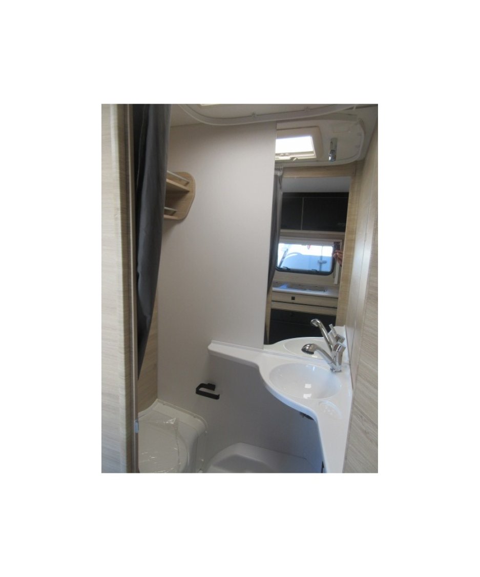 Cette implantation tout confort offre un lit central de belle dimension (150x195) et un grand salon en U. La caravane dispose de beaucoup de rangements et d'une trappe d'accès extérieure sous le lit.