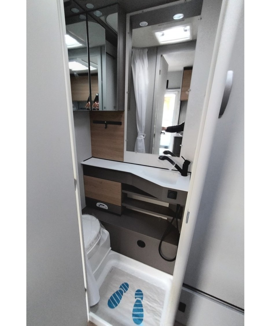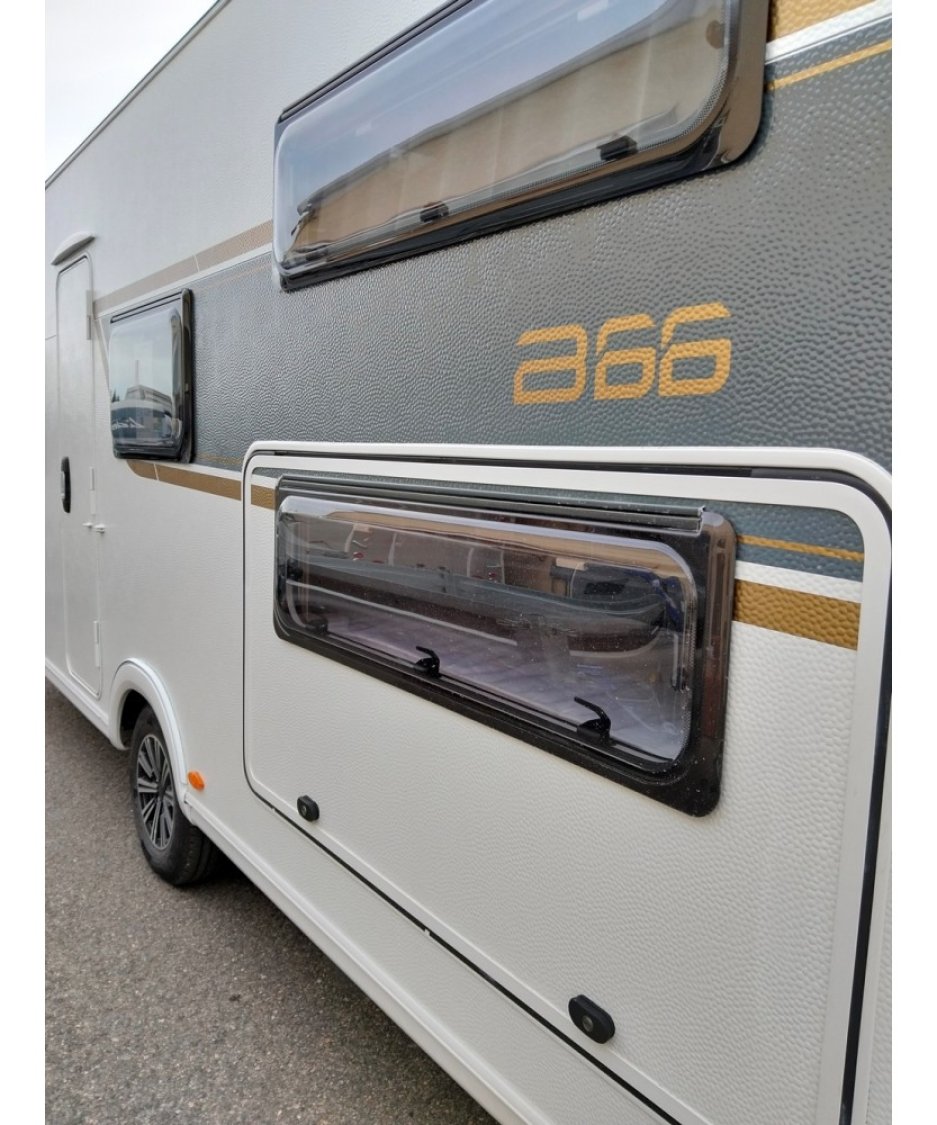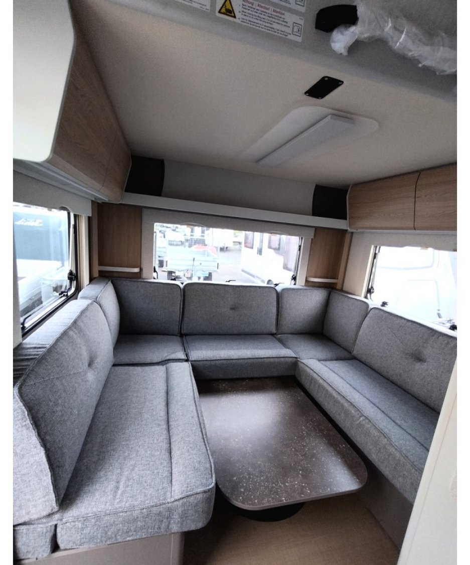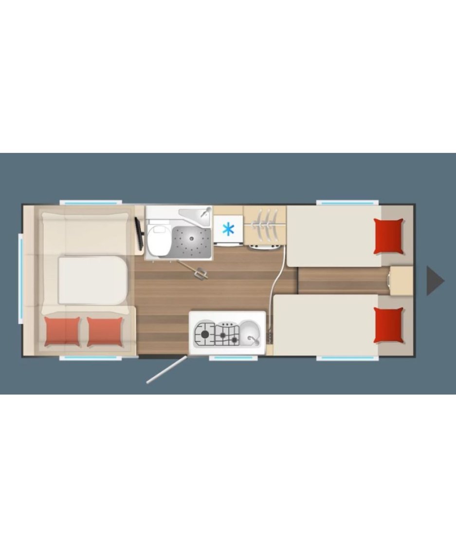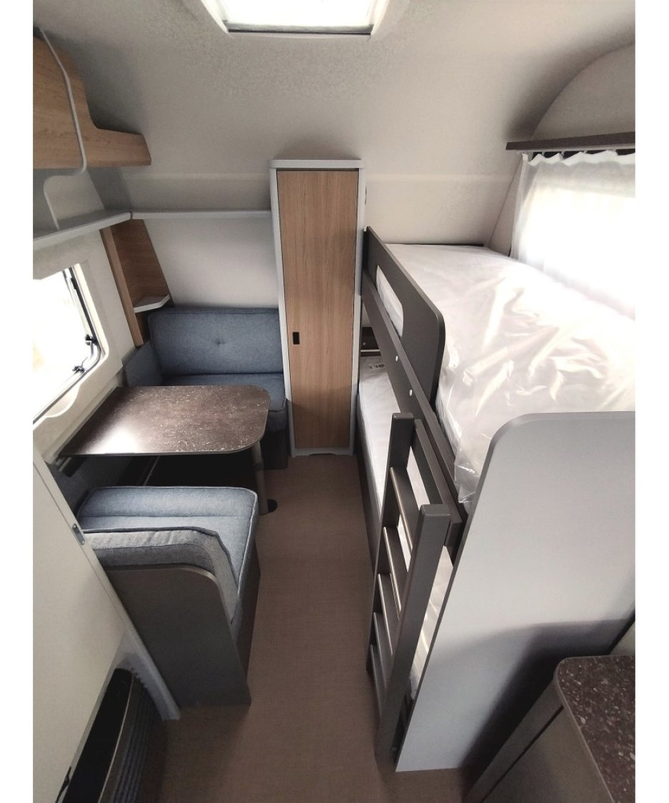 Une belle caravane familiale jusqu'à 7 personnes. A l'avant on retrouve une chambre d'enfants avec deux couchettes superposées et un petit salon convertible en lit d'appoint. A l'arrière un second salon transformable en lit double est surplombé par un lit pavillon escamotable, accessible via une échelle fournie de série