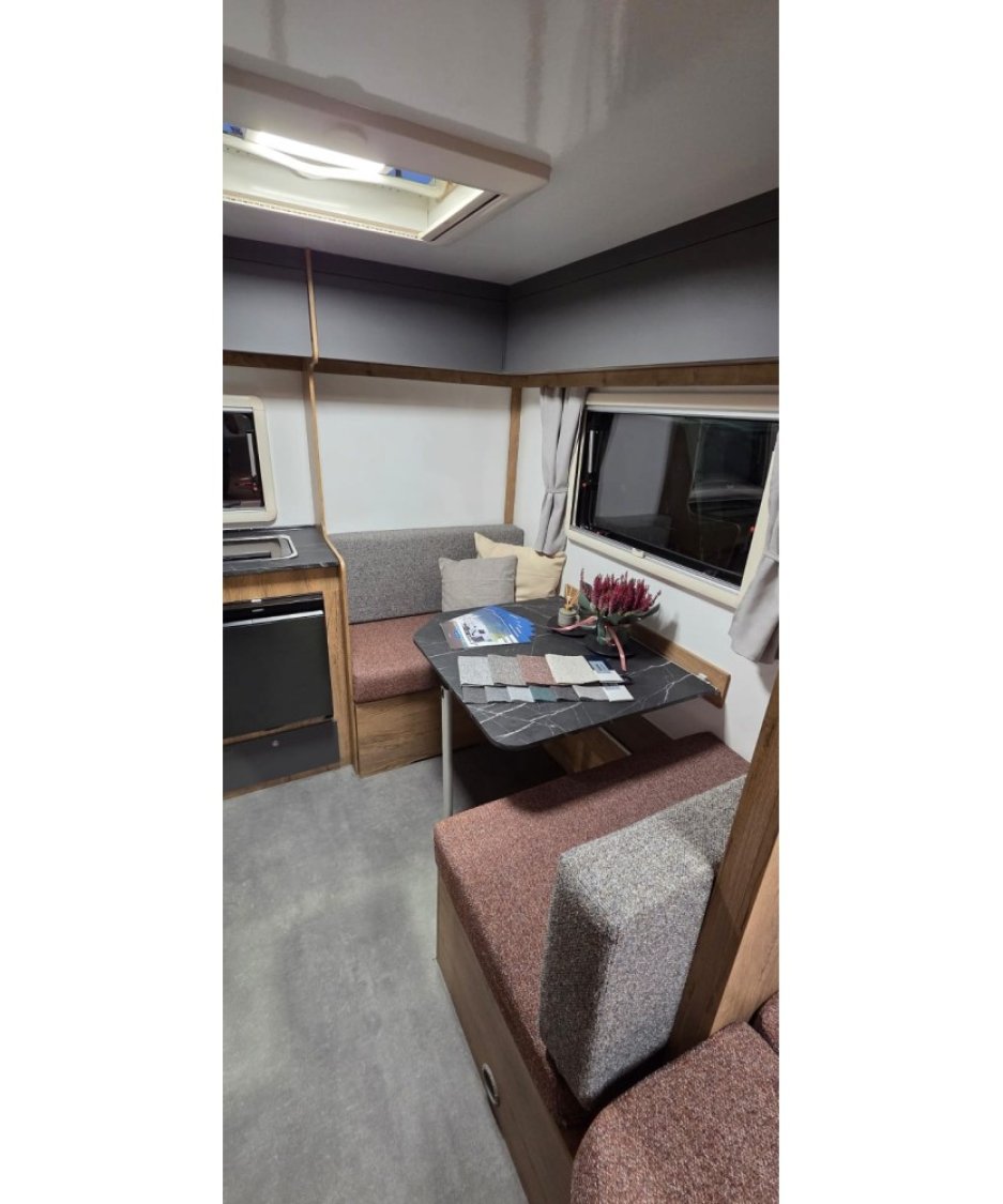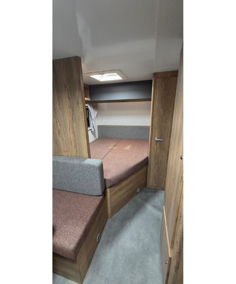 Elle possède un lit fixe ainsi qu'une dinette transformable, des rangements généreux ainsi qu'un coin salle de bain.