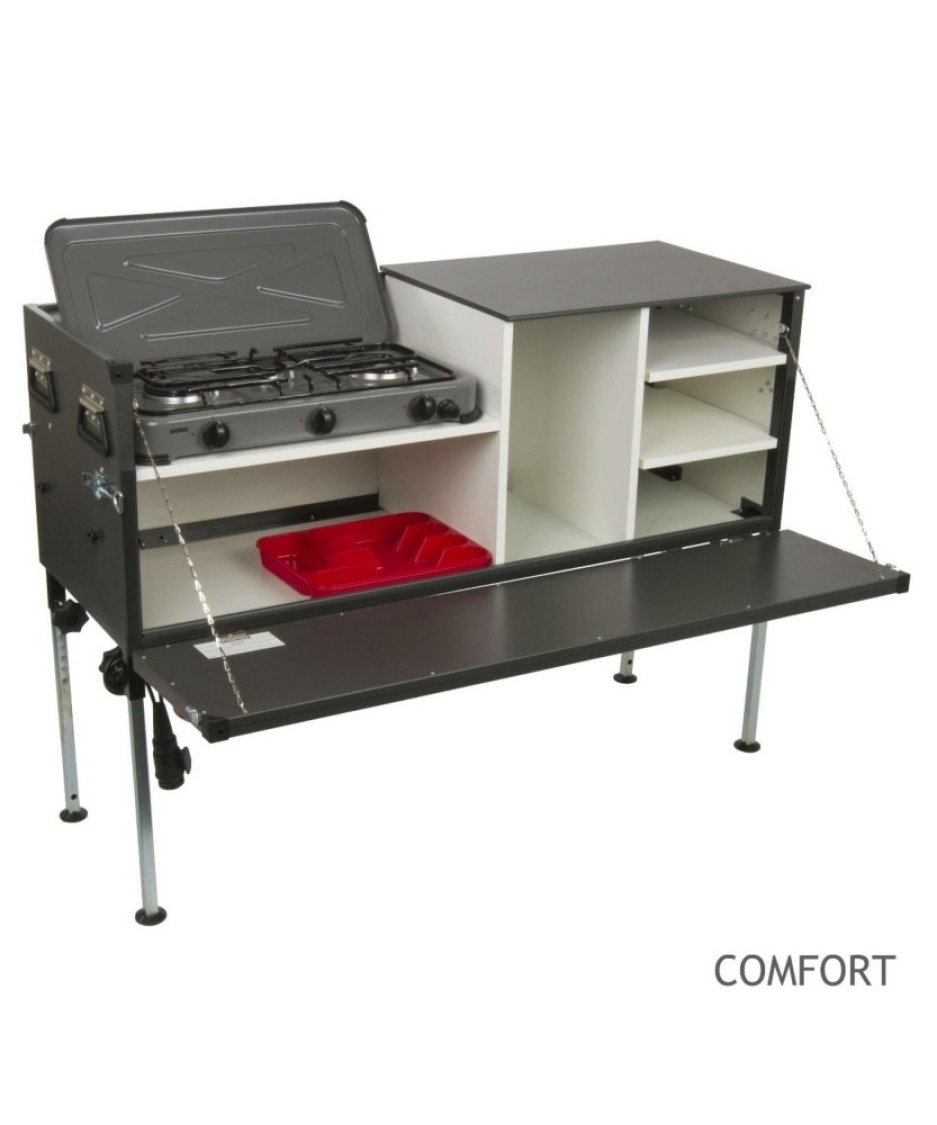 Cette caravane pliante vous assurera un confort intérieur en toutes circonstances grâce à sa grande fenêtre cuisine avec moustiquaire et volet pour une aération optimisée. Très grand séjour sous l’auvent, 2 chambres séparées offrant des couchages surélevés avec sommiers et matelas intégrés, de multiples rangements astucieux cousus dans la toile. Sous les plateaux de lits, vous pourrez ranger tout ce dont vous avez besoin pour votre séjour en camping ou créer des couchages d’appoints complémentaires grâce aux tentes intérieures en option