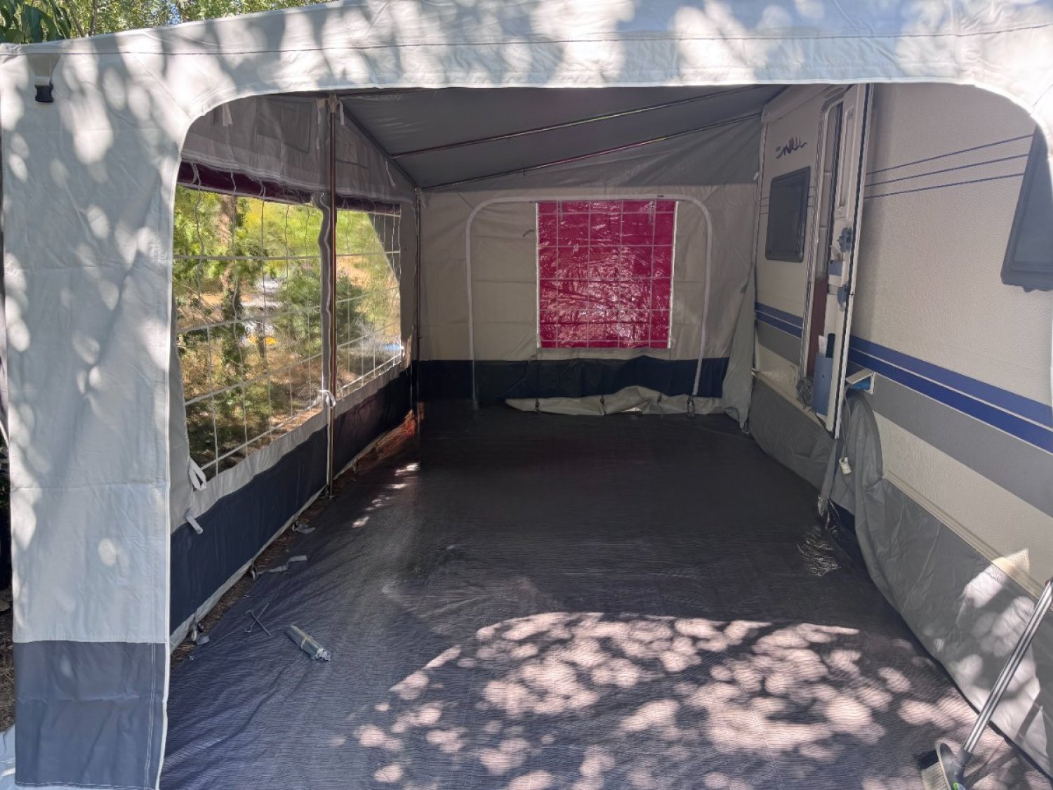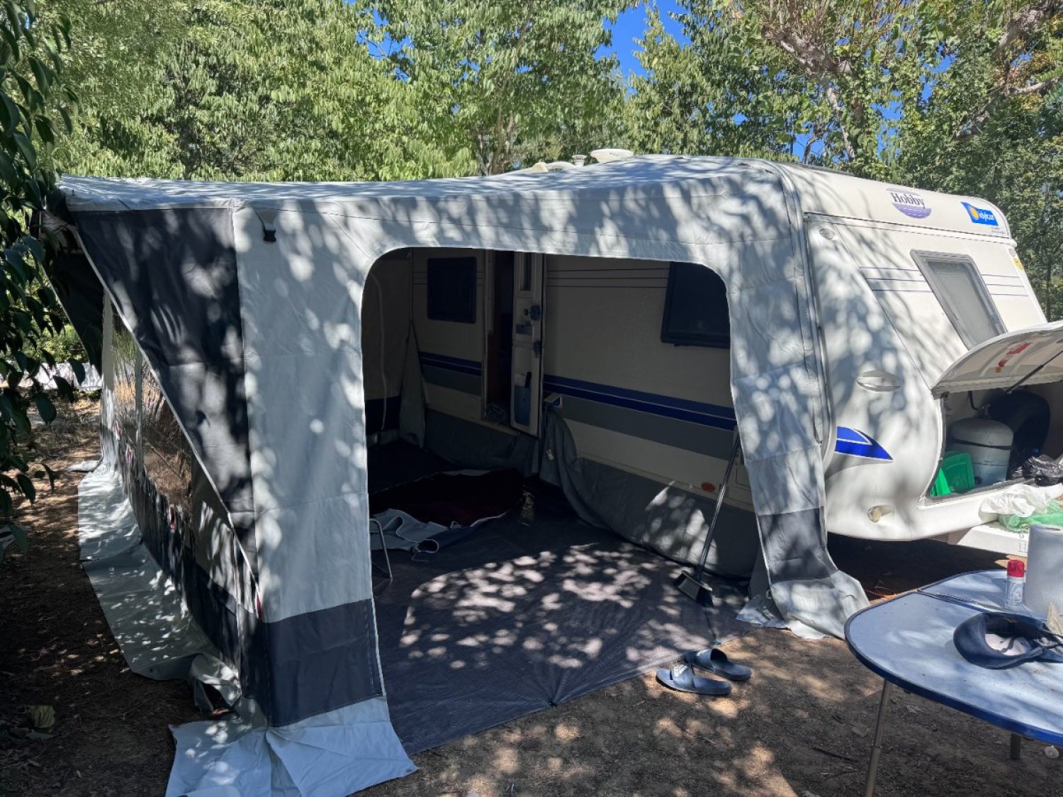 Nous vendons notre caravane de marque Hobby exellent easy 460, dans un excellent état, toujours garée sous abri. Chauffage à gaz Truma avec option air pulsé, douche, toilette à cassette, évier, cuisine, frigo trimixt 220v-12v ou gaz, bec à gaz, véritabe lit 2 personnes de 140x190 + couchette banquette transformable en lit 2 personnes, télévision ecran plat (pour lecteur DVD/bluray). Store et moustiquaire à chaque baie vitrée+porte d'entrée, stabilisateur anti-lacet (tenue de route optimale), nombreux rangements, roue de secours, bouteille de gaz quasi pleine. Store banne avec son auvent + 1 auvent 4 saisons en PVC de 5x3m+ 1 chambre supplémentaire, table, 4 fauteuils, toute la vaisselle et literie (prête à l'emploi). La caravane est en gardiennage à Laroque-des-Albères (15 min d'Argeles) et payé jusque Août 2026.
