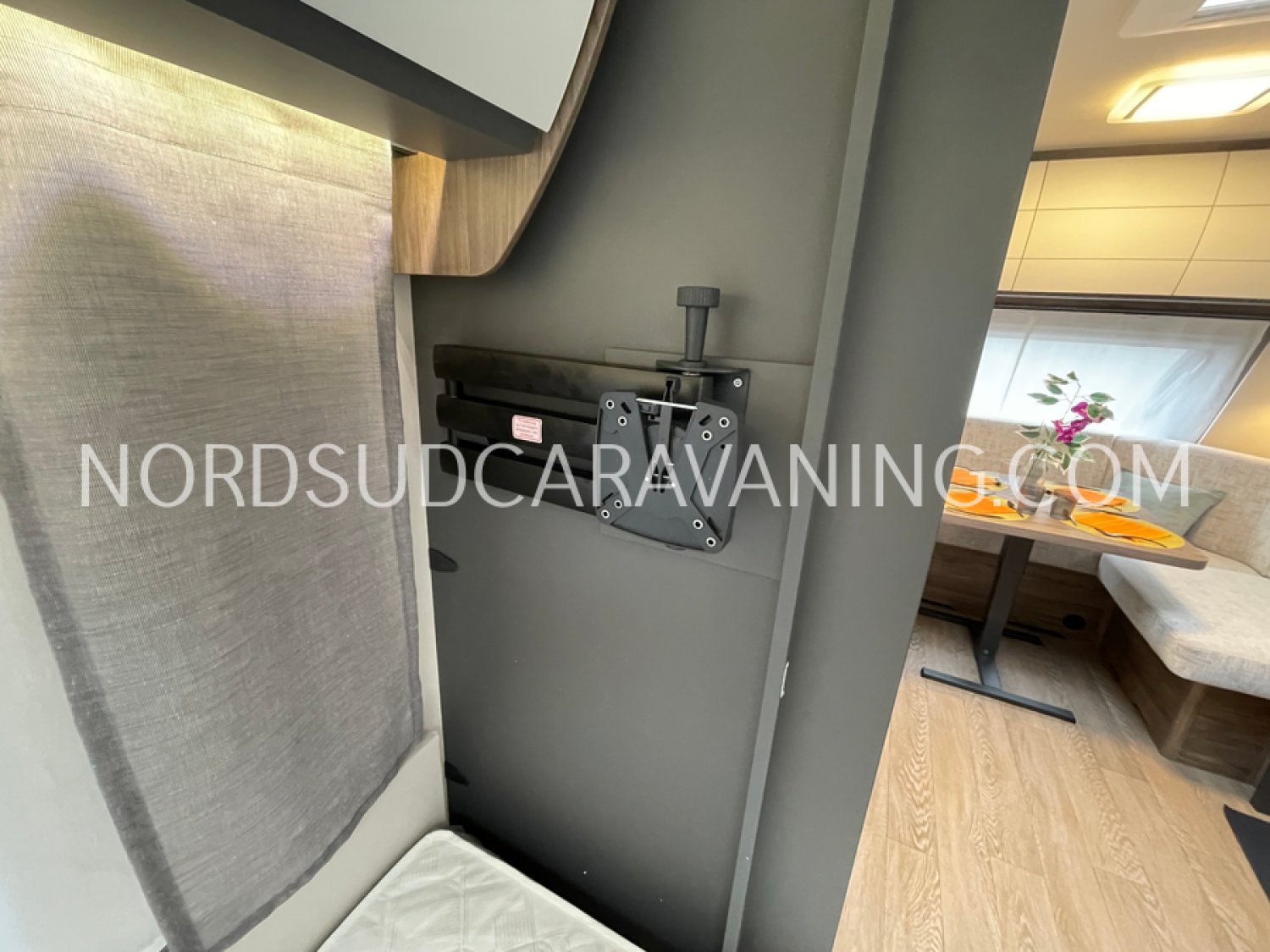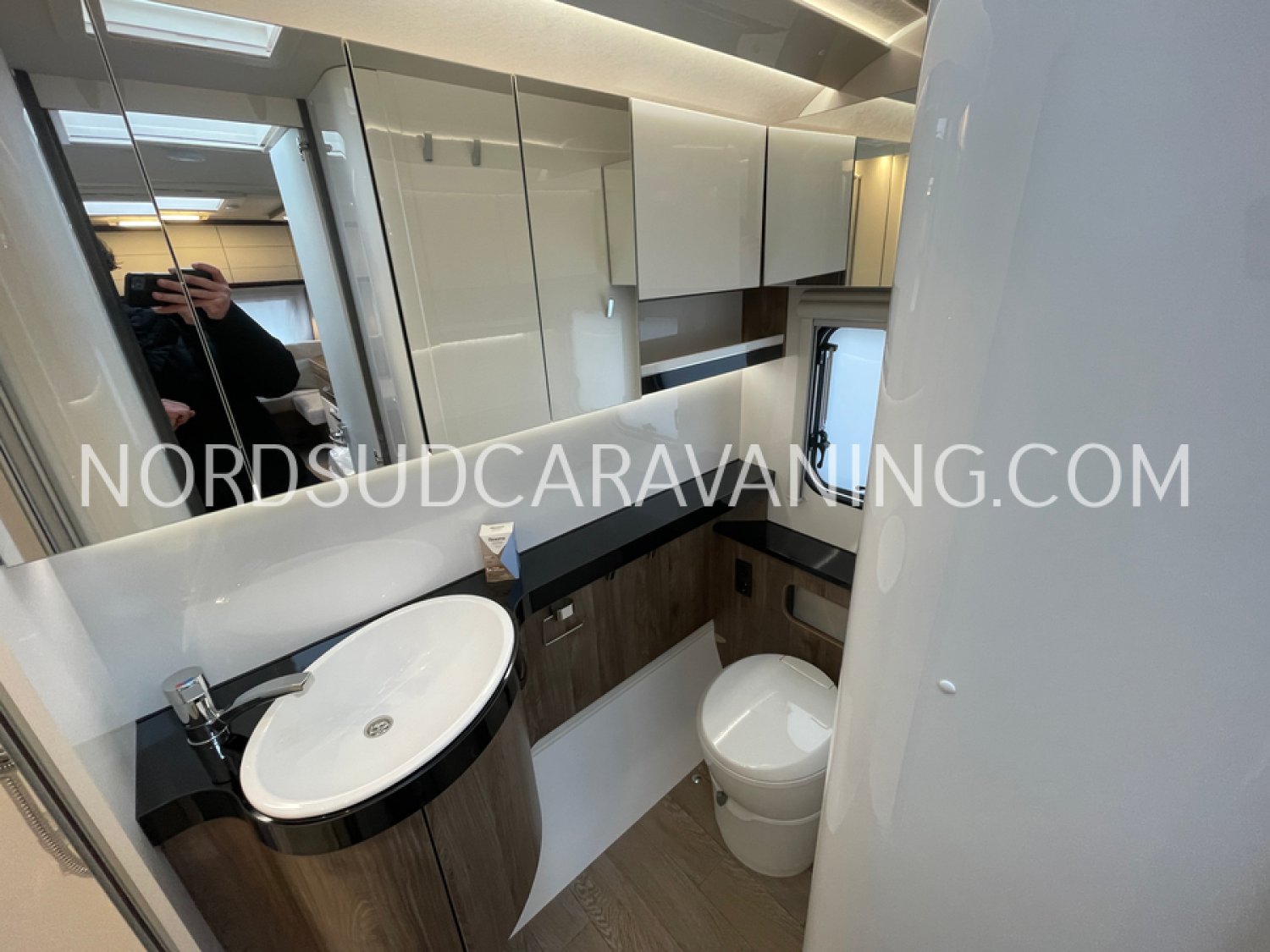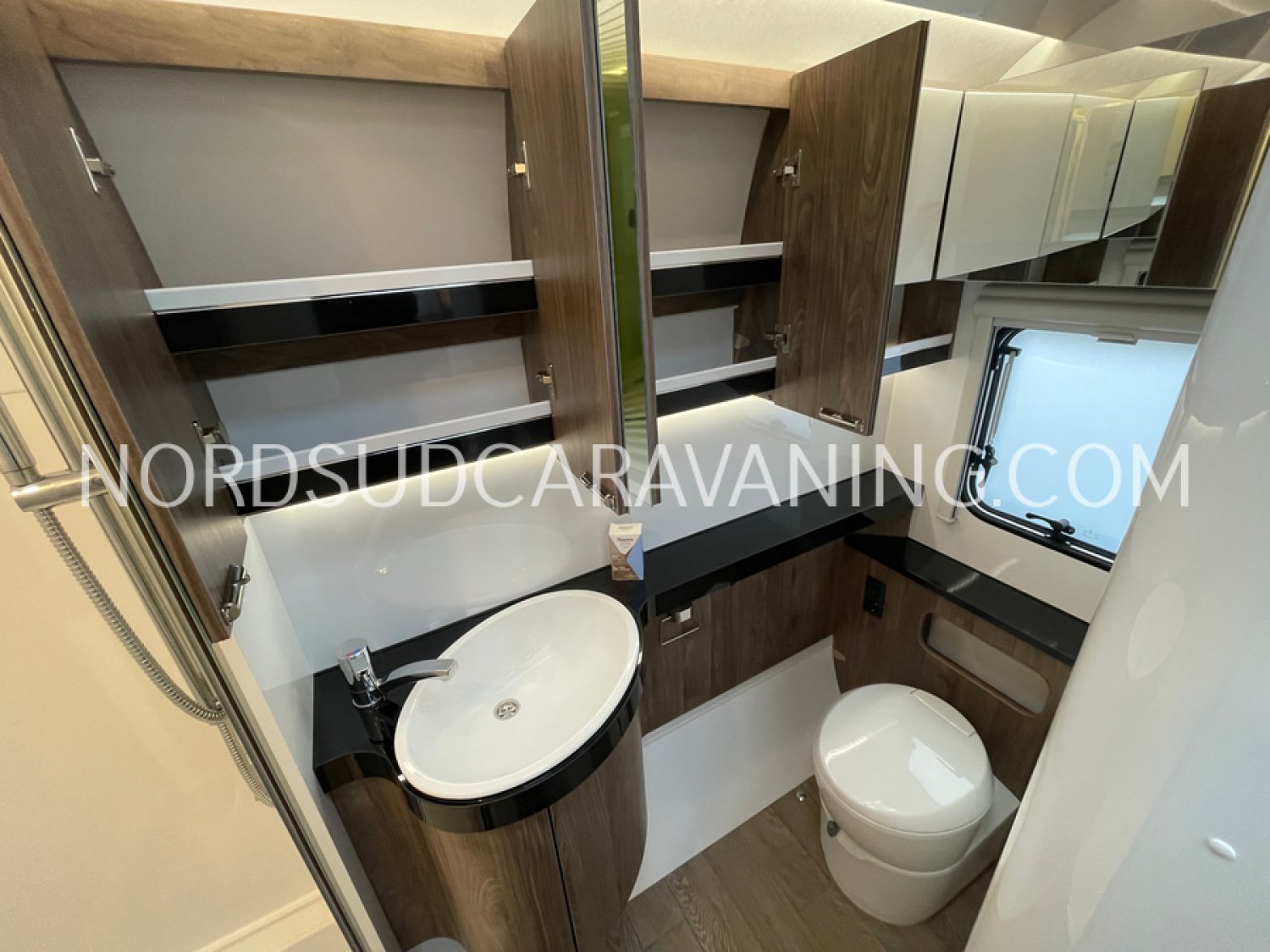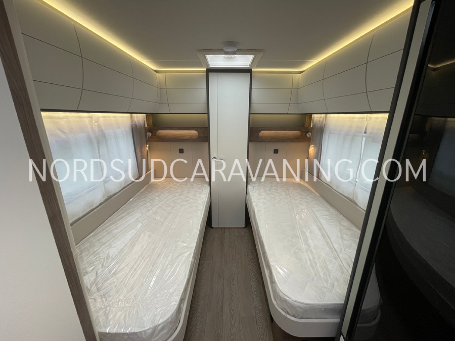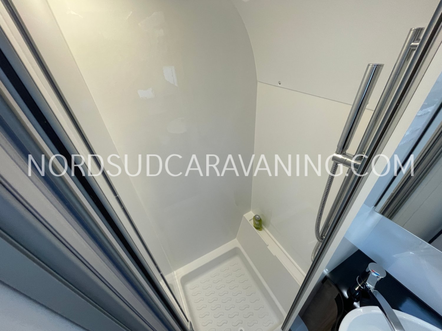 Elle est très agréable à vivre avec son joli salon en U transformable en couchage pour 2 personnes. Très bel espace nuit avec ses lits jumeaux très confortables et ses nombreux rangements. Cuisine spacieuse équipée d’un réfrigérateur à absorption de 133L, d’un réchaud 3 feux gaz, d’un évier cuve inox et de placards de pavillon. Elle a également un joli espace salle de bain à l’arrière avec WC à cassette, Lavabo et une véritable cabine de douche séparée.