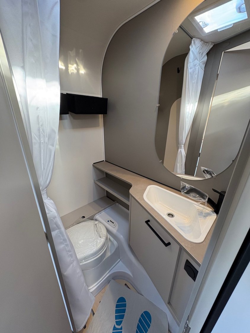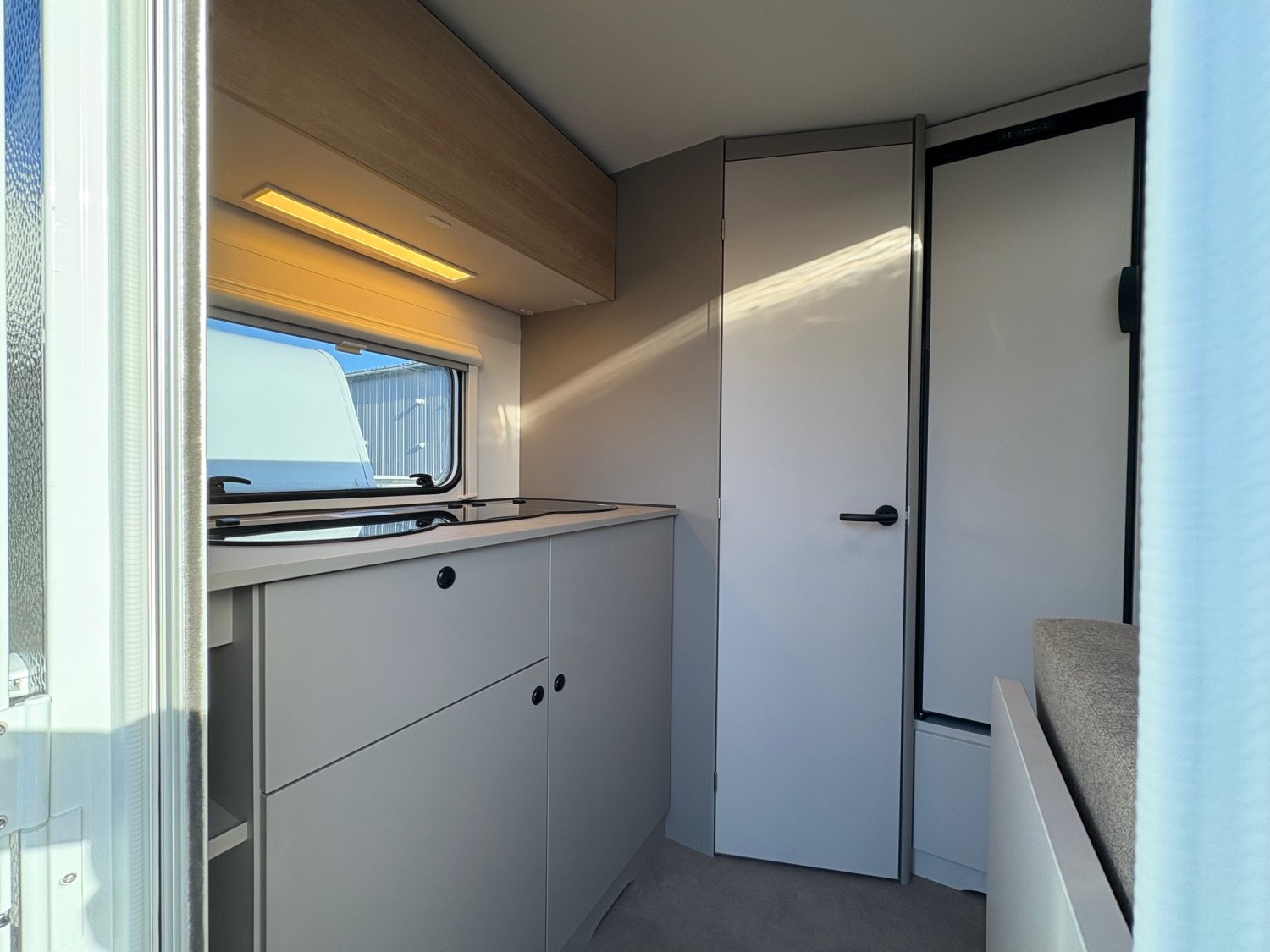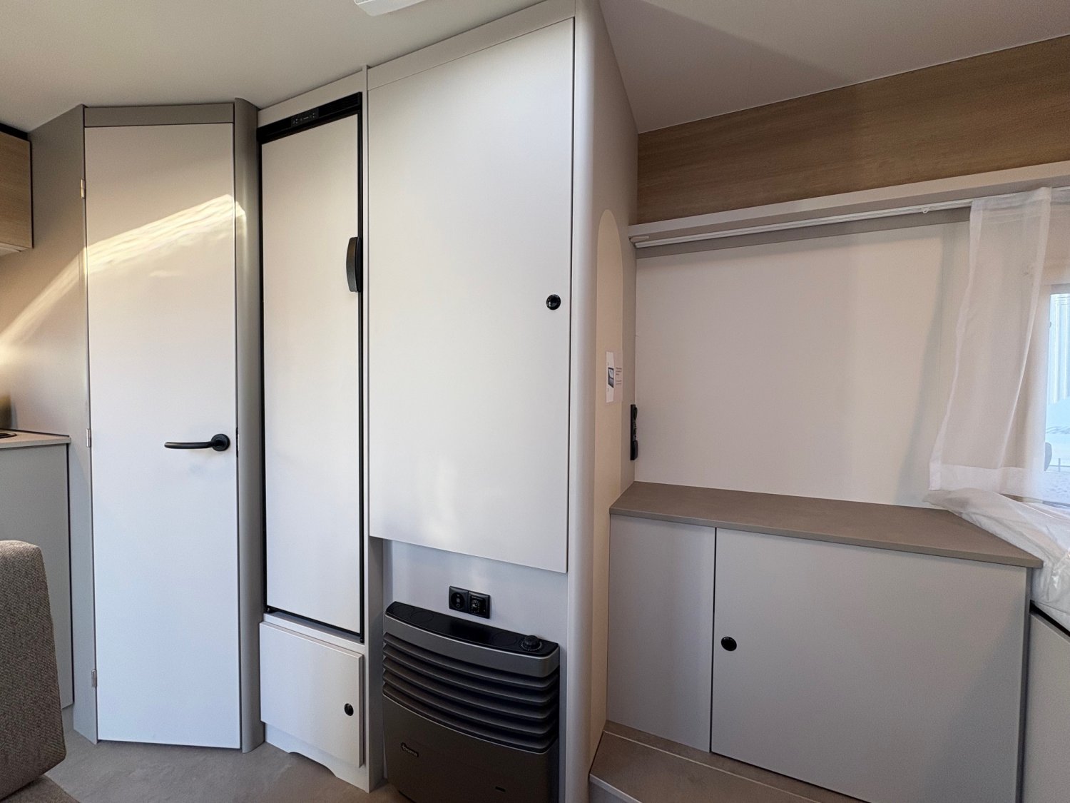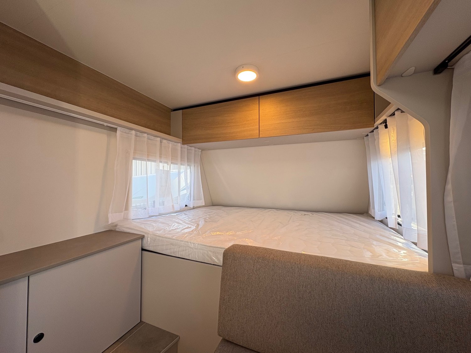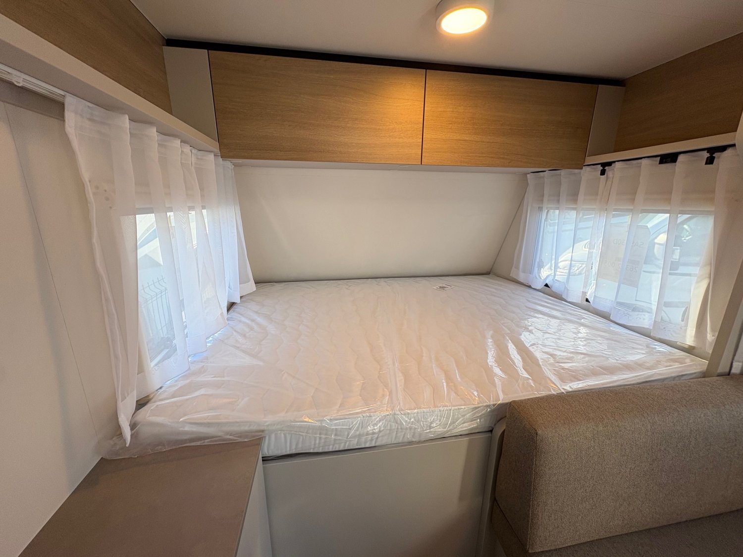 Réservoir eaux usées 25 l sur roulettes, Fixation pour la roue de secours dans le coffre à gaz, Porte moustiquaire, Chauffe-eau pour l’approvisionnement en eau chaude 5 l (mitigeur d’eau chaude inclus), Chauffage à air pulsé 230 V, Lanterneau avec verre translucide 700 x 500 mm avec store occultant et moustiquaire, Prédisposition TV (1x prise 12V, 2x câbles antenne SAT/TV), Éclairage supplémentaire (rail avec spots), Prédisposition pour climatiseur de toit avec renfort, Prises USB pour rail (x2), Roue jockey avec indicateur de charge, Réservoir eau propre 44 l avec ouverture de remplissage extérieure, Big Foots pour vérins stabilisateurs