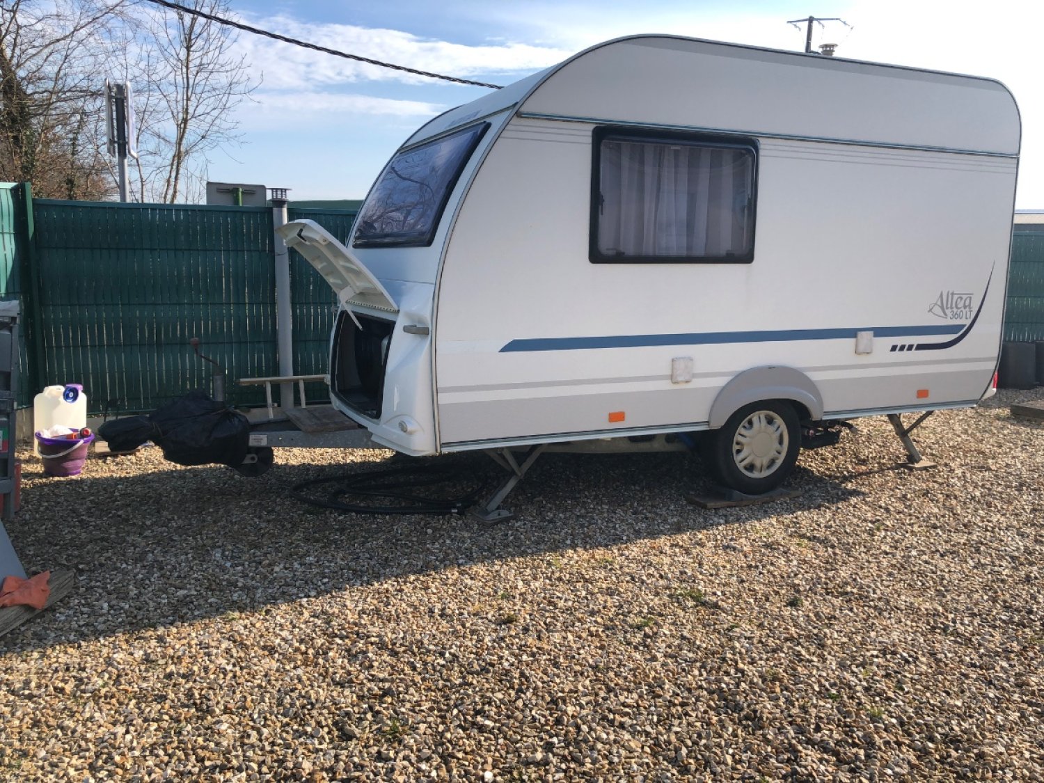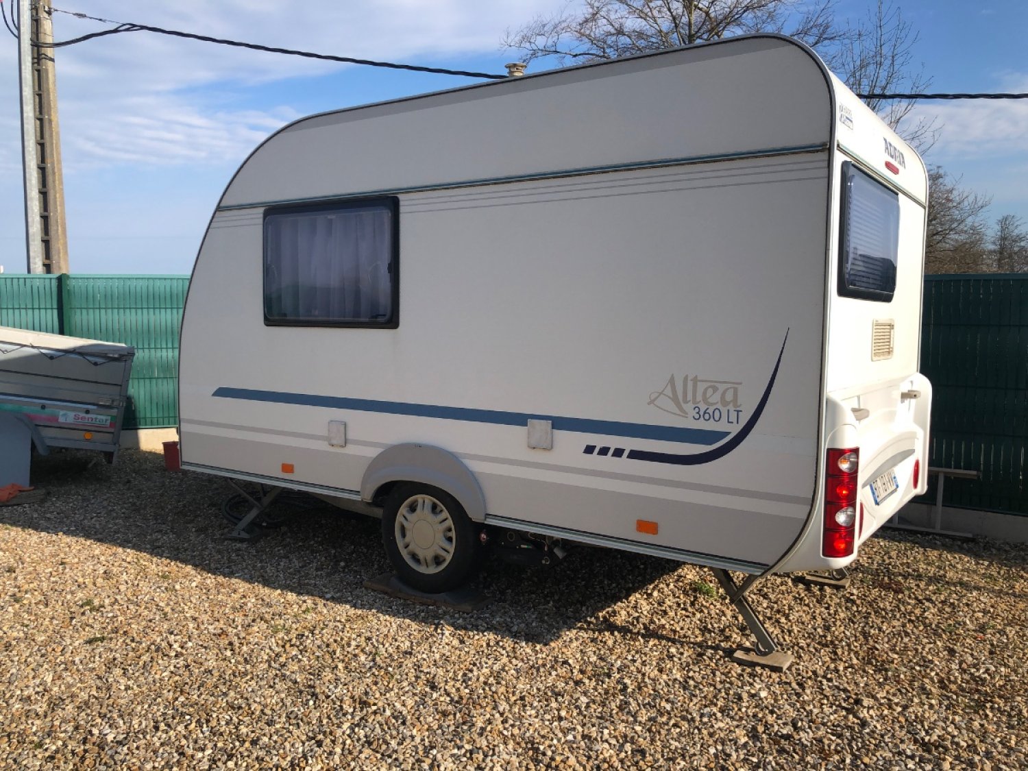 A vendre caravane Adria Altéa 360 LT mise en circulation 10/09/2011 avec déplace caravane vendue avec auvent et tapis de sol. Table transformable en grand lit 3 couchages. wc a cassette électrique lavabo frigo trimix cuisine 3 bruleurs gaz cumulus eau chaude truma réservoir eau propre 50l stabilisateur alko roue de secours auvent profondeur 2,40 câble rallonge 50 m.